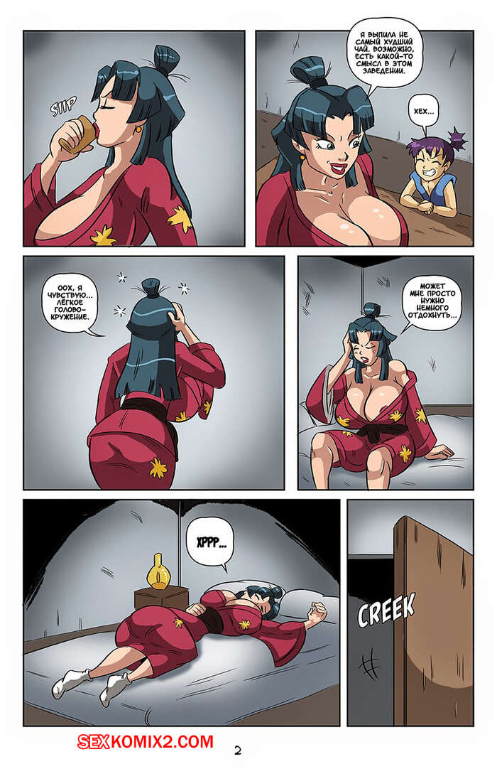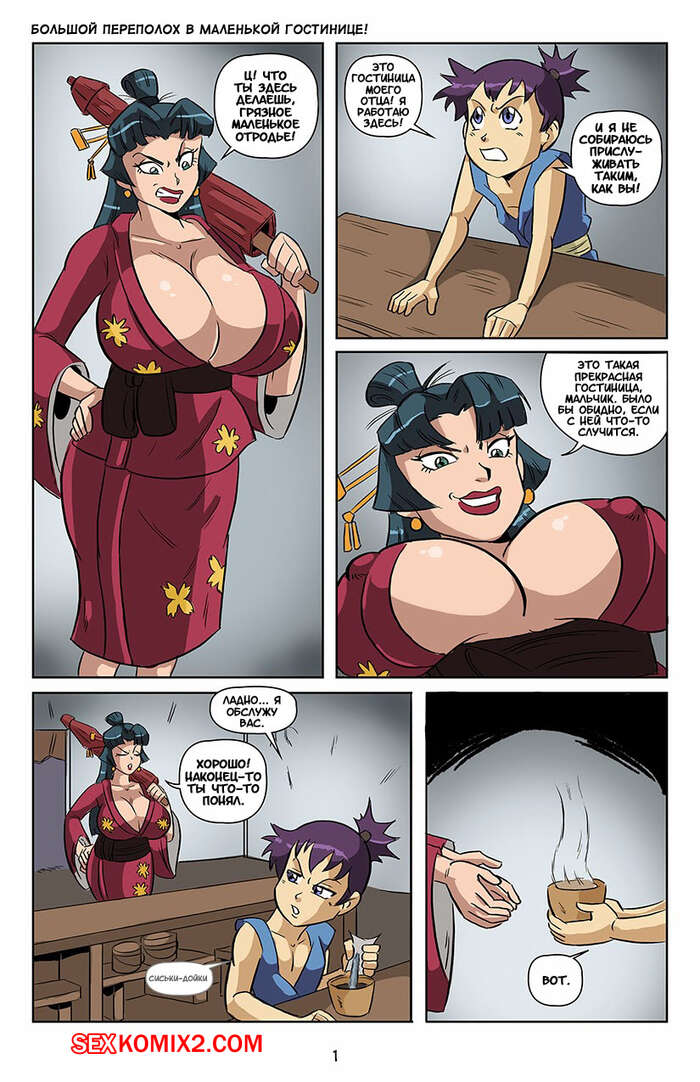 Порно комикс Большой переполох в маленькой гостинице. Big Trouble at the Little Inn Сисястая брюнетка милфа крепко уснула и маленькая девушка с членом решила этим воспользоваться. Она стала ласкать большие сиськи спящей дамы, после чего выебала ее пизденку.