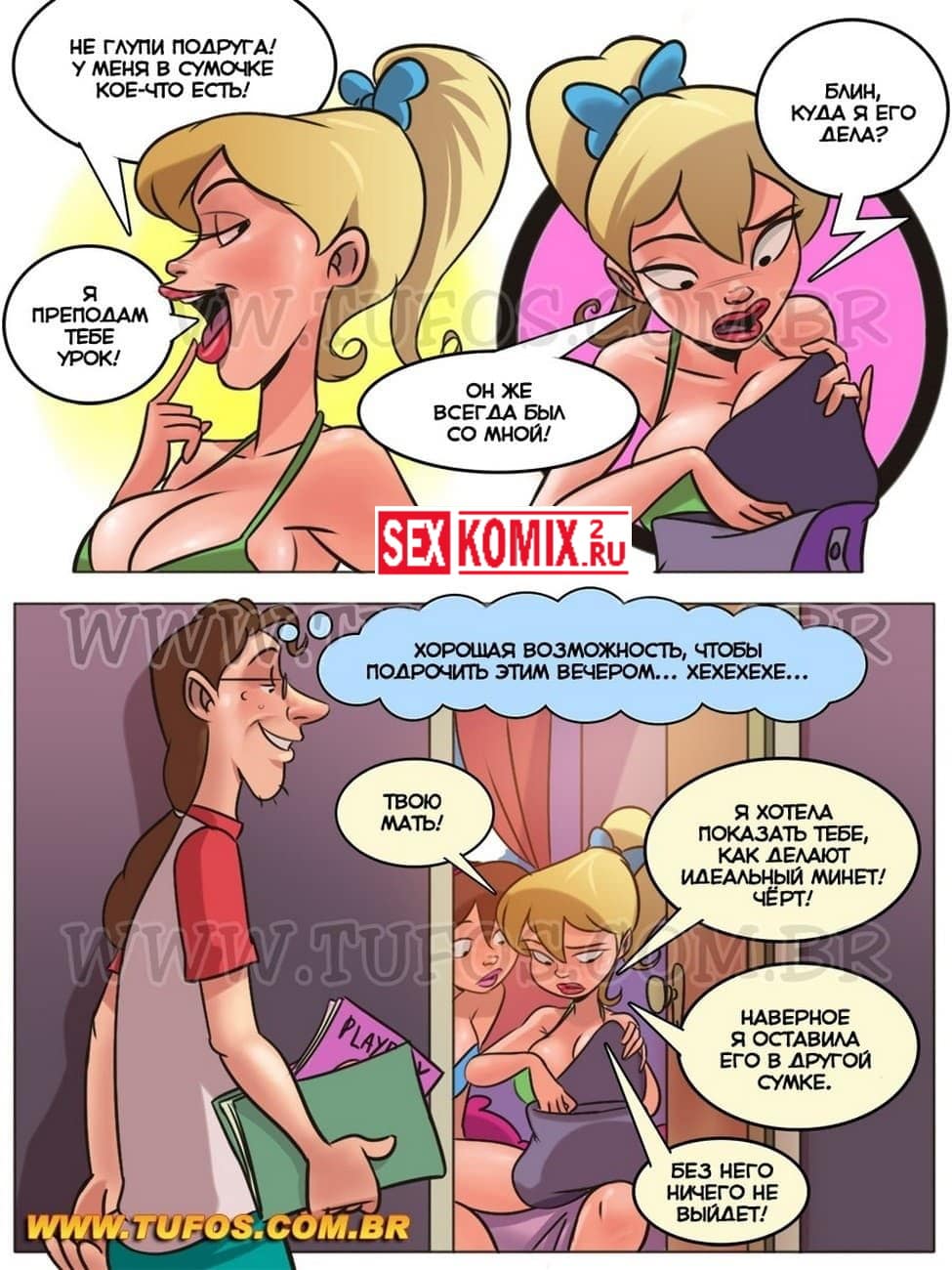 Порно комикс Похотливая семейка. Часть 5. Урок подруги. На этот раз все начинается с того, что Анина плачется подружке по поводу того, как ее бойфренд в последние дни мало уделяет ей времени. Он стал редко звонить и навещать ее. Тогда лучшая подруга решает научить её абсолютно идеальному минету, который обязательно помог бы ей вернуть расположение любимого парня. Но для этого нужен член, и как раз к стати оказывается её брат. Девушки заманили беднягу к себе в комнату, сняли с него штаны и начали изучать минет на его огромном члене.