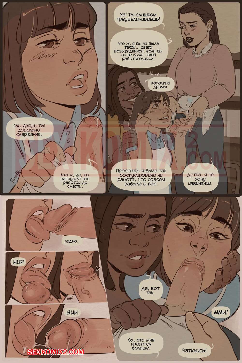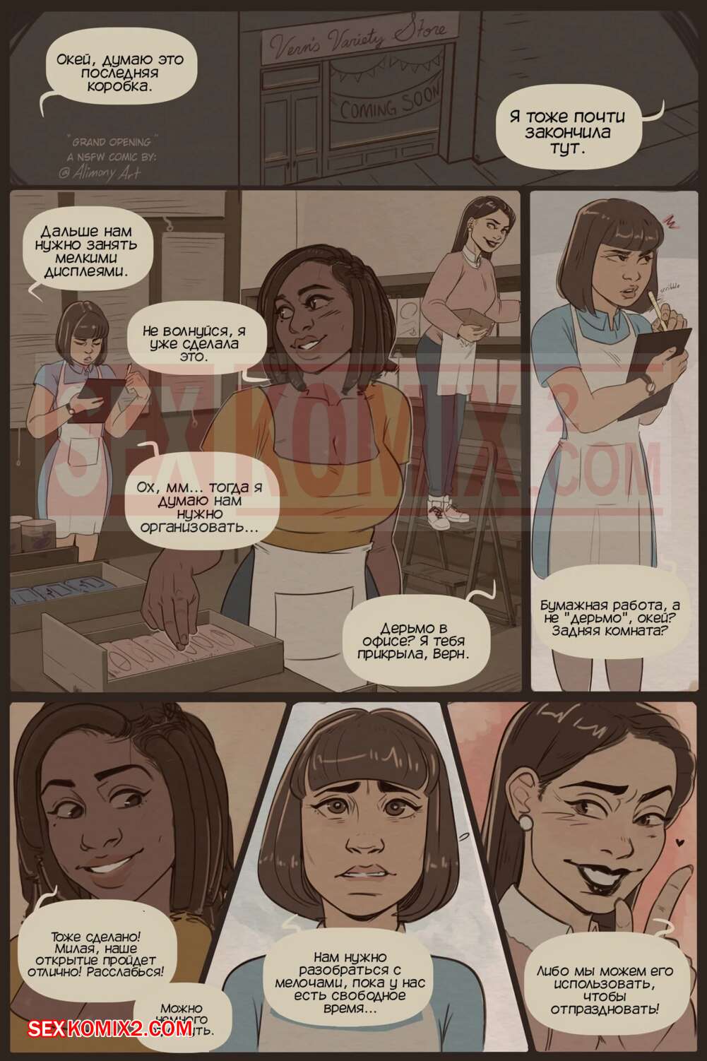 Порно комикс Торжественное открытие. Grand Opening. AlimonyArt Три горячие красотки готовятся к отрытию своего магазина и решили сделать небольшую паузу. Две девушки разделись и стали сосать хуй своей подруги, после чего дали ей у себя отлизать.