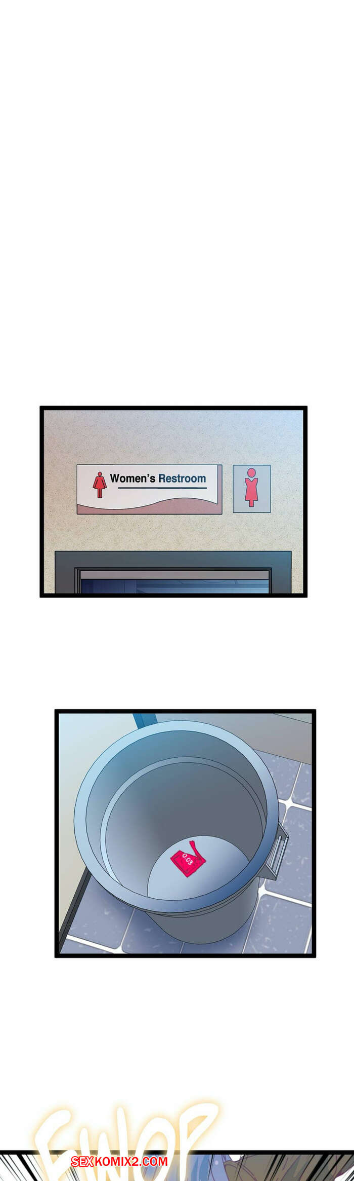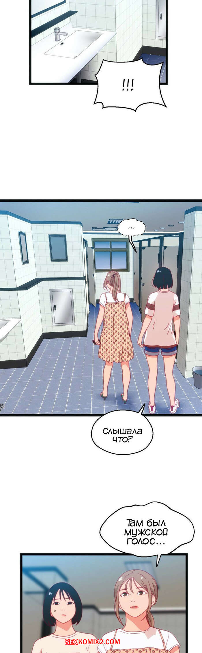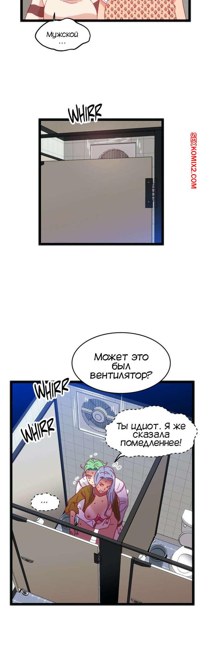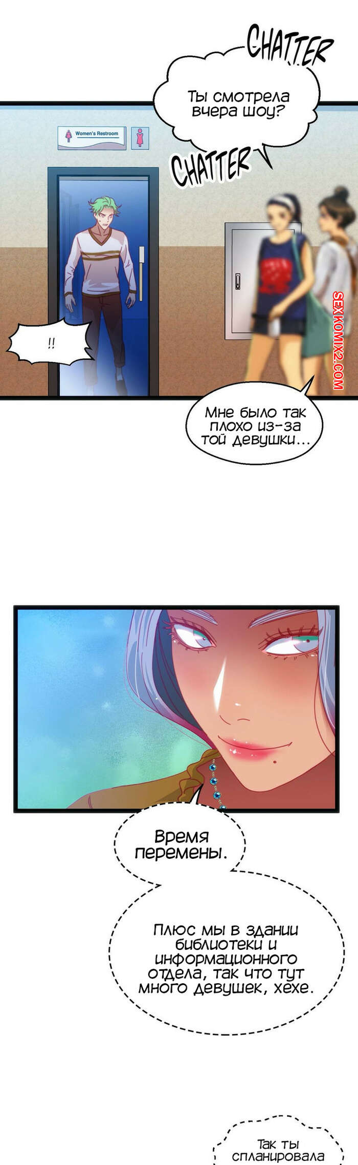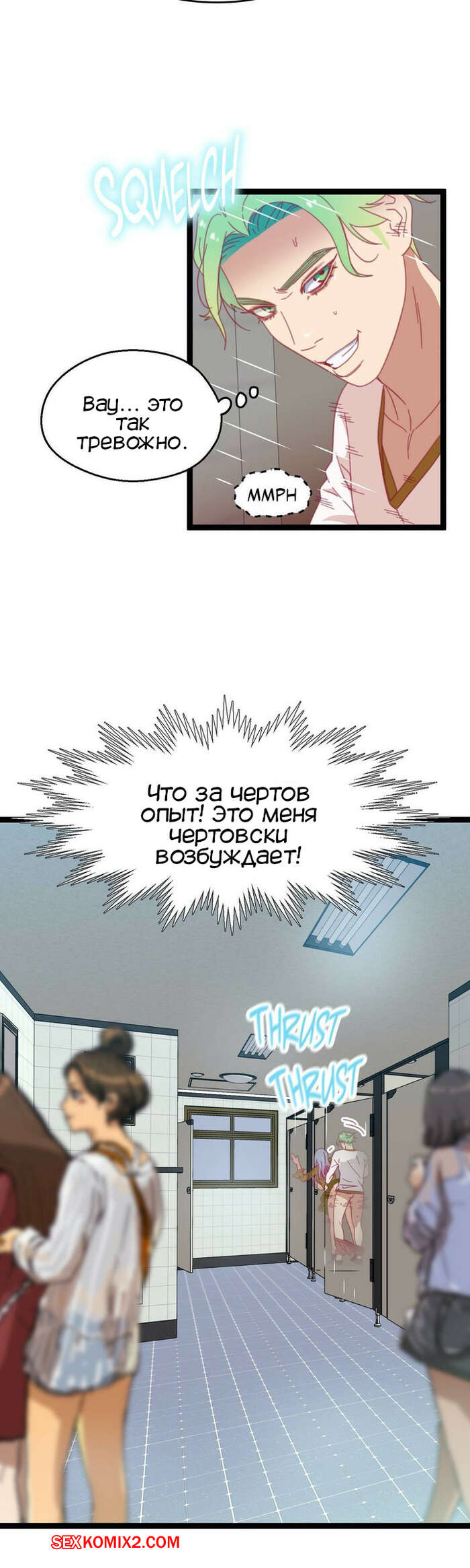 Порно комикс Игра с телом. Часть 46. The Body Game Сисястая блондинка затащила парня в женский туалет и стала ему угрожать, что испортит его жизнь, если он не останется. Сучка разделась и стала сосать его большой хуй, после чего стала его трахать.