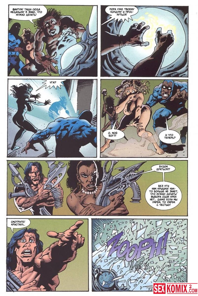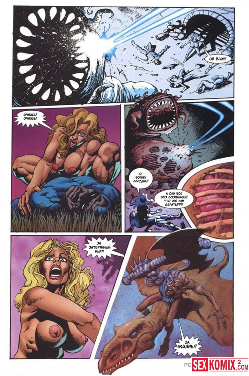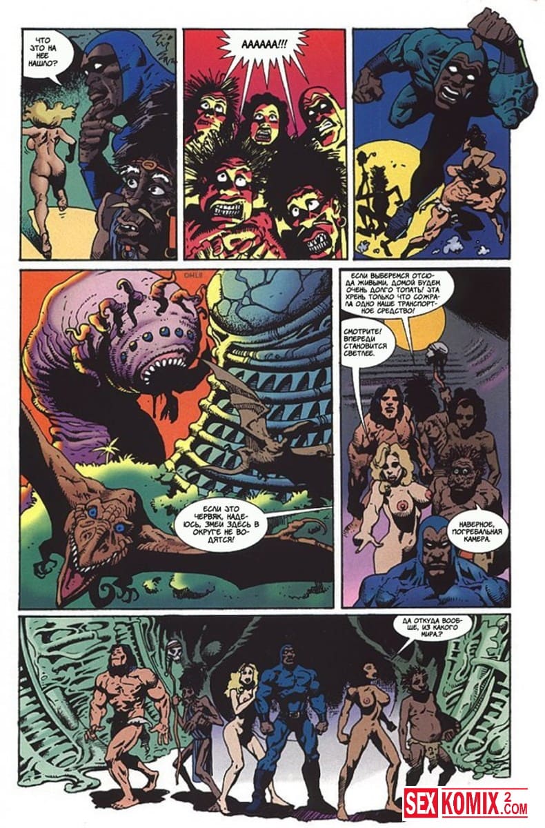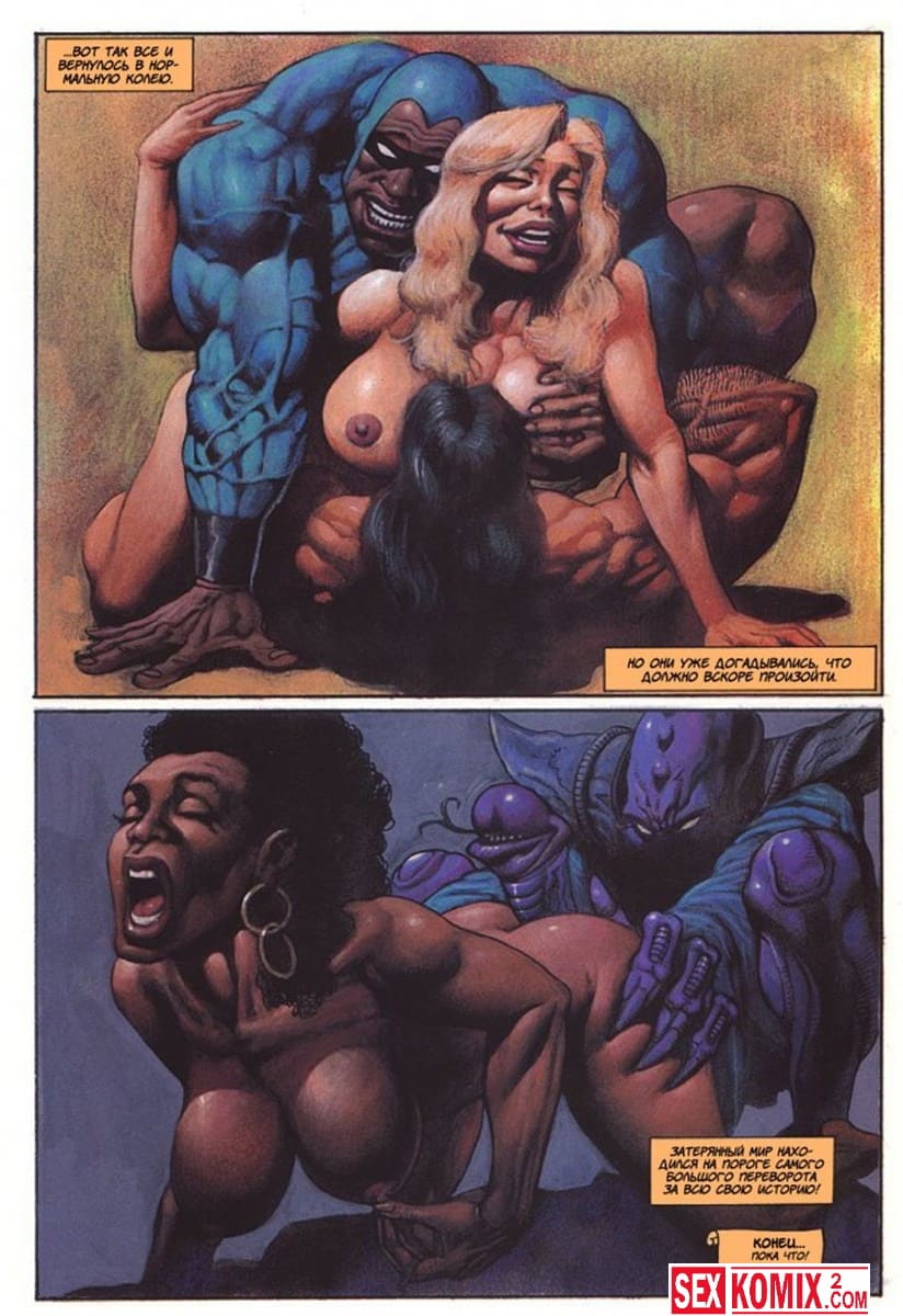 Порно комикс Латиша и затерянный мир. Часть 4. Доблестные девушки, чернокожая брюнетки и блондинка с большими сиськами отправились на бой со злым колдуном, который управляет гигантский монстром.