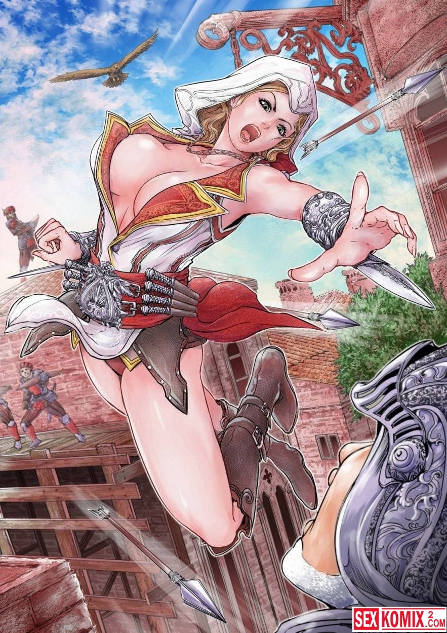 Порно комикс Assassin XXX II. История девушки ассассина, она попыталась прорваться в замок. Но охрана оказалась проворней и всё-таки поймала красотку. Парни давно хотели позабавиться с ней.