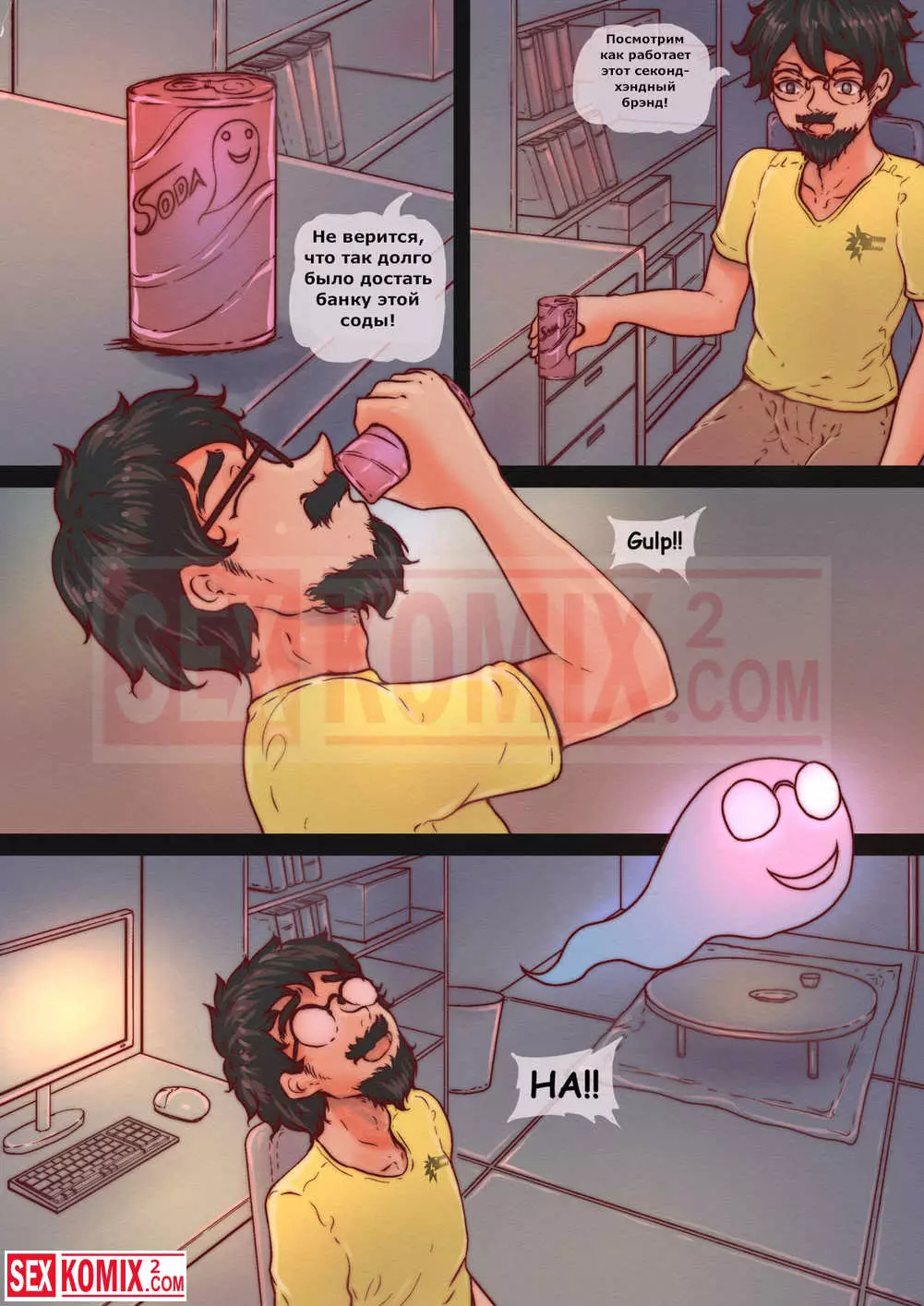 Порно комикс Одержимость содовой. В городе появился очень странный признак, это дух содовый газировки из бутылки. Когда кто-то открывал бутылку, он вырывался наружу и летел к какое-нибудь сексуальной девушке, чтобы внушить ей, что она хочет заниматься сексом прямо здесь и сейчас. Когда он долетает до ближайшего дома и вселяется в тело девушки, и хочется заниматься сексом, но рядом никого нет. Поэтому она берёт резиновый член, и трахает себя им.