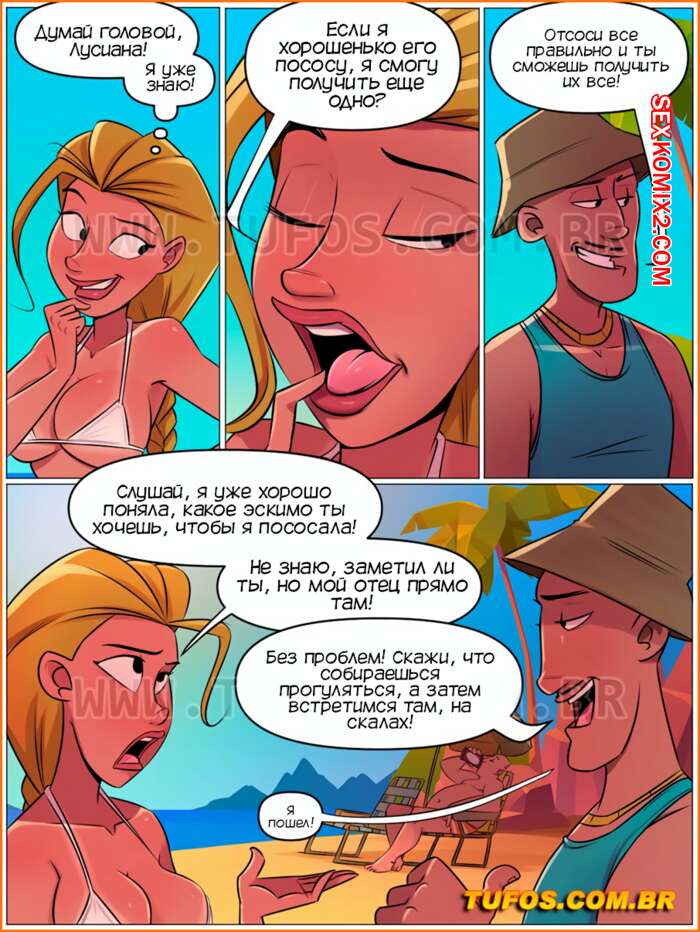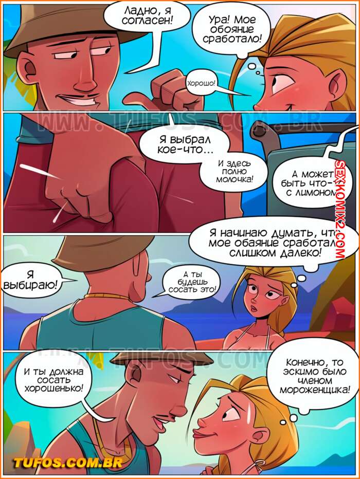 Порно комикс Дом мамы Джоаны. Часть 25. Минет. Casa da mae Joana. Tufos Сисястая блондинка захотела мороженное на пляже, но у нее не было денег. Парень дал красотке отсосать свой большой хуй, после чего выебал ее в пизду и задницу, в обмен на огромное количество мороженого.