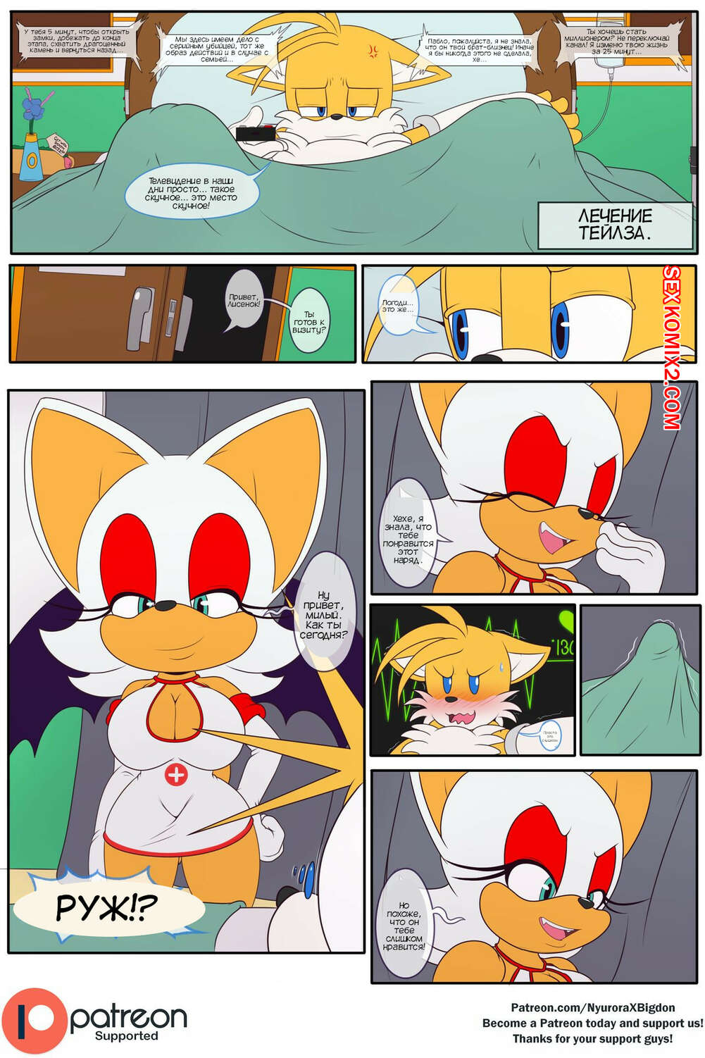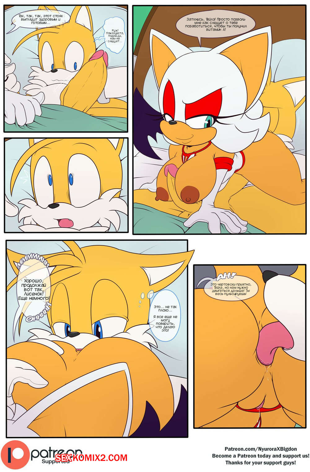 Порно комикс Соник. Лечение Тейлза. Tails Treatment. nyuroraxbigdon Тейлз приболел и Руж пришла к нему, чтобы заняться лечением парня. Красотка отсосала большой хуй лисенка, после чего дала ему себя хорошенько выебать и кончить в нее.