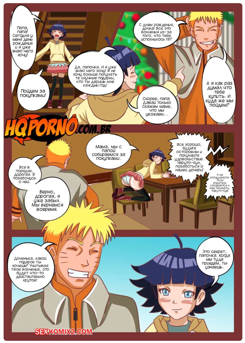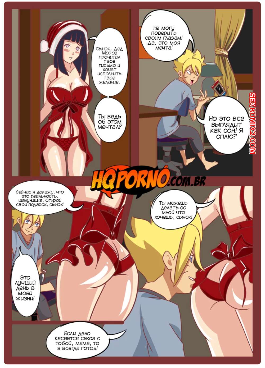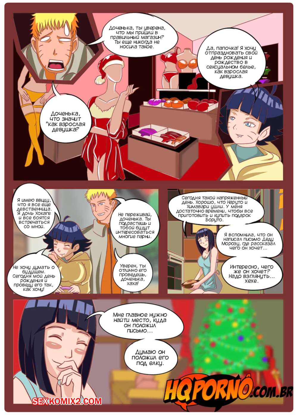 Порно комикс Наруто. Рождество семьи Узумаки. Часть 1. Natal da família Uzumaki. HQPorno Хината узнала, что Боруто хочет ее трахнуть. Милфа надела сексуальный наряд и отправилась в комнату к сыну, чтобы заняться с ним сексом. Тем временем Наруто и Химавари пошли покупать девушке сексуальное белье, после чего доченька решила лишиться девственности с папочкой.