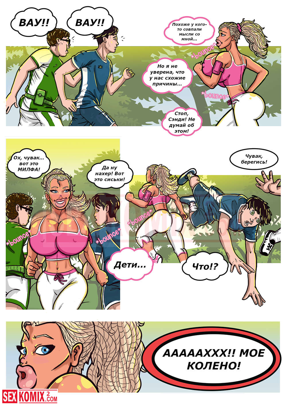 Порно комикс Тайная жизнь Сэнди. Часть 4. Утренний фитнес. Развратная блондинка с большими буферами во время утренней пробежки познакомилась с парнями и дала им себя трахнуть.