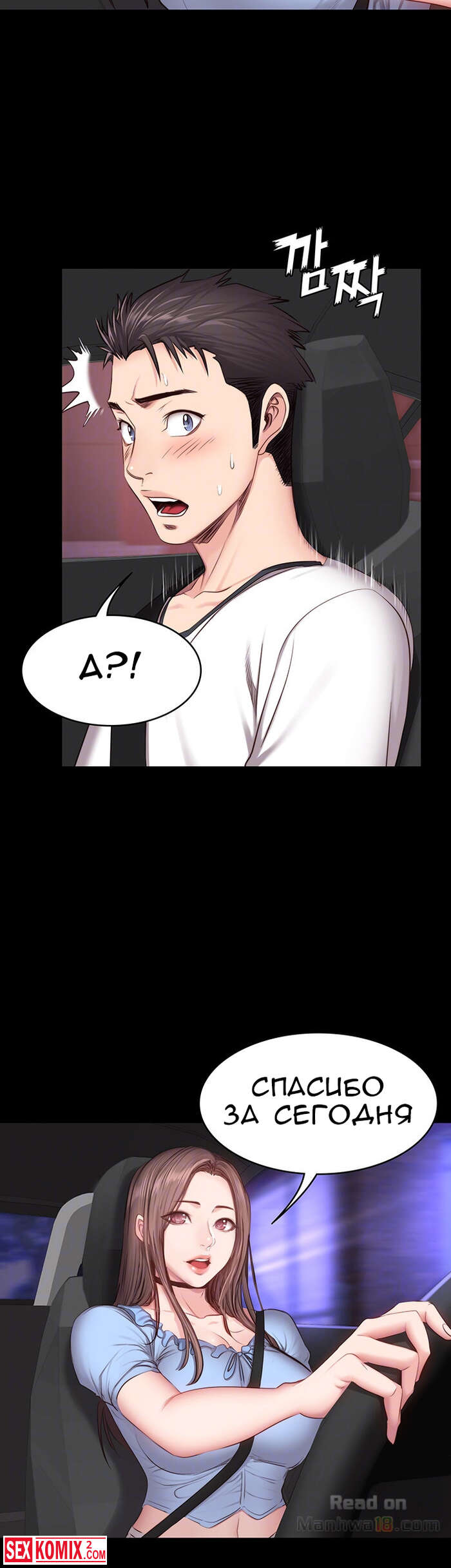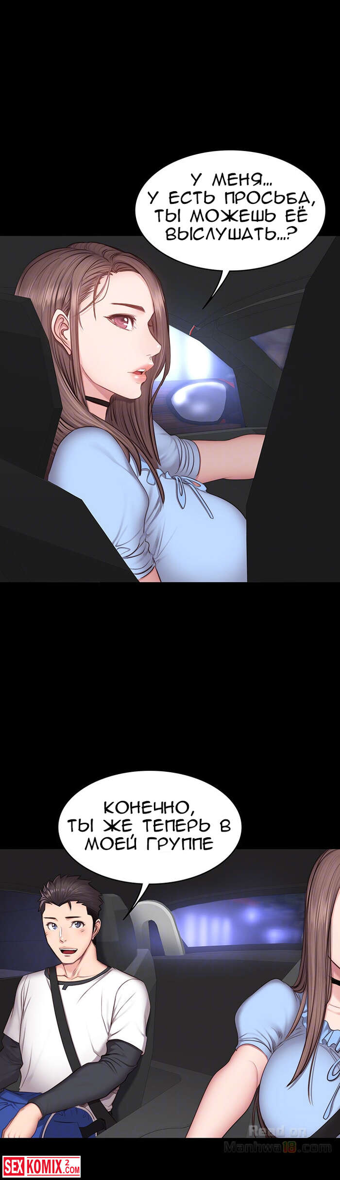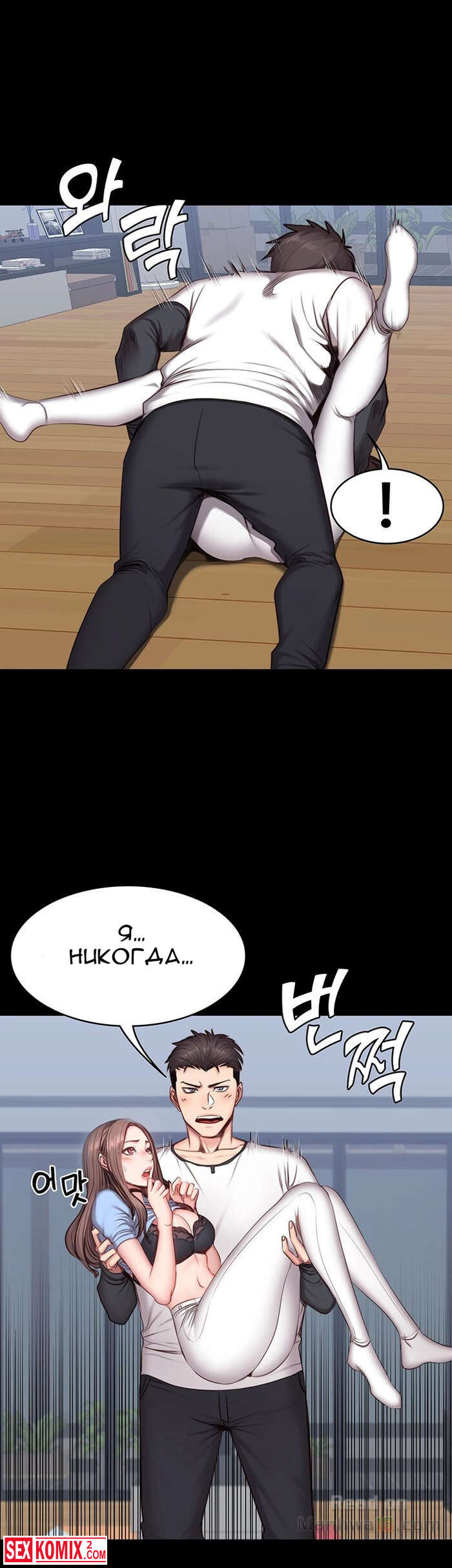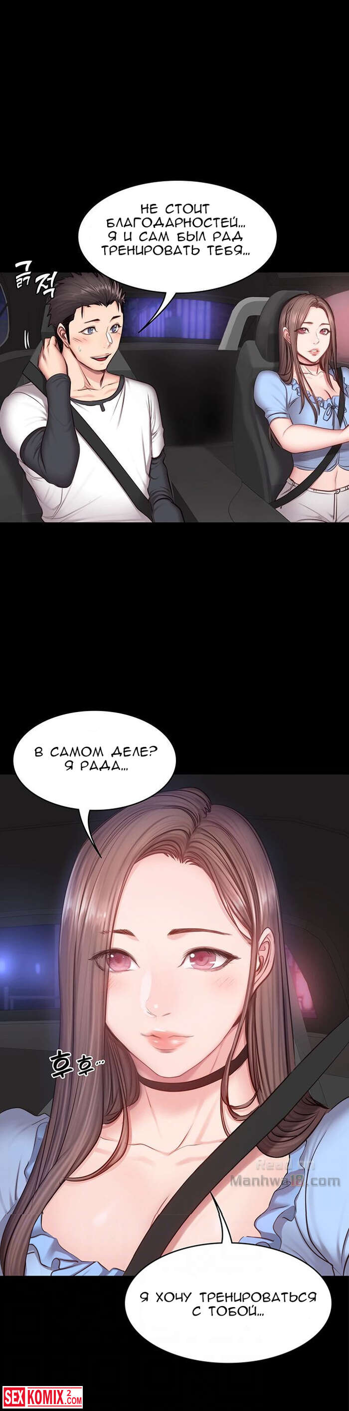 Порно комикс Фитнес. Часть 14 и 15. Девушка подвезла парня и по дороге попросила его помочь ей по дому, на самом деле это был предлог чтобы затащить его к себе домой.