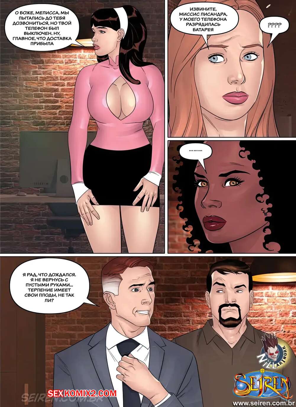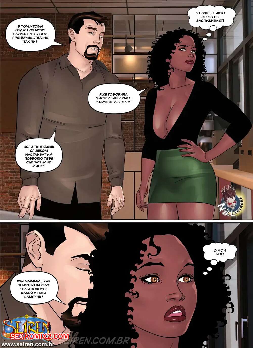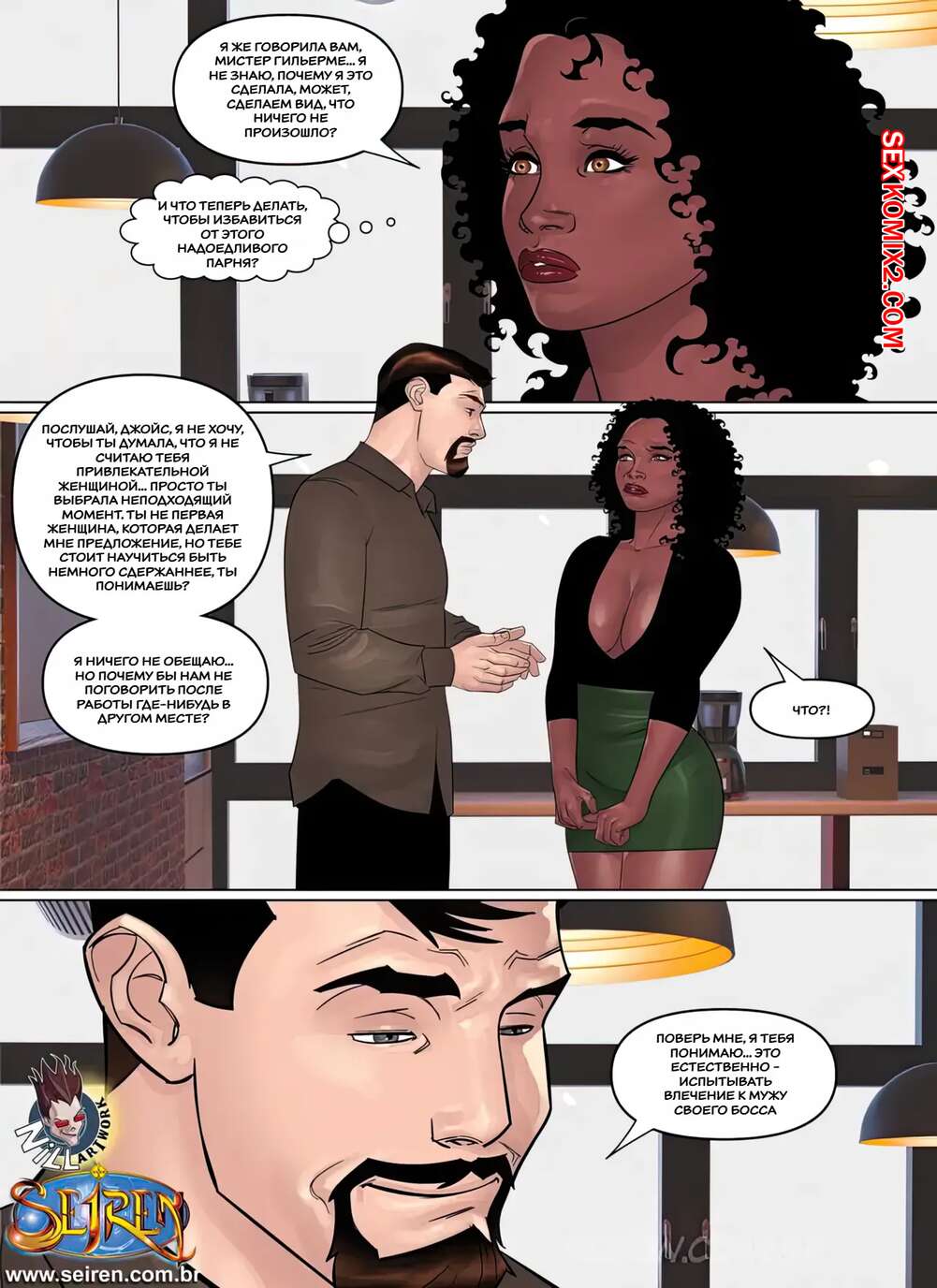Порно комикс Дочерняя компания Лиcандры. Часть 1. Эпизод 2. Lisandra Subsidiary. Seiren Темнокожая брюнетка увидела через окно свою коллегу в кабинете у босса. Горячая милфа встала на колени перед начальником и отсосала его большой хуй, после чего дала ему себя выебать.