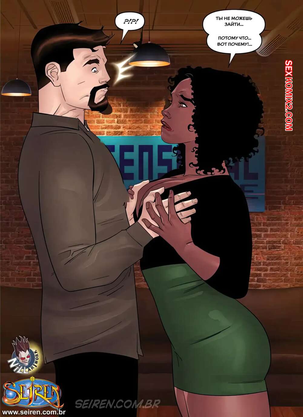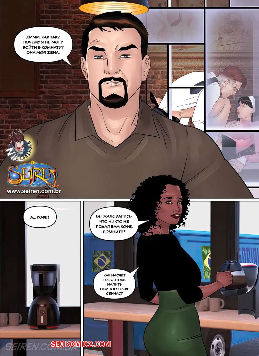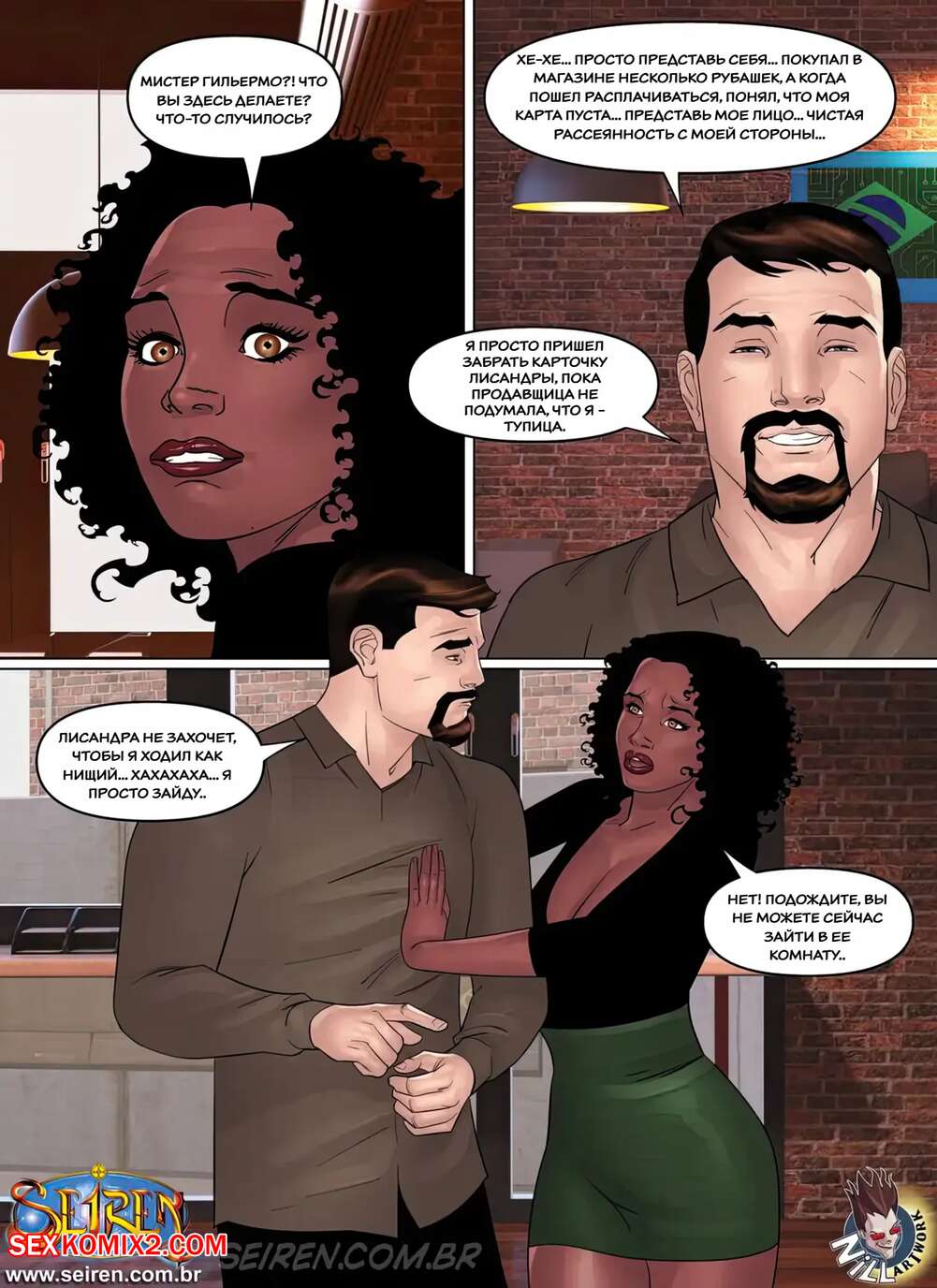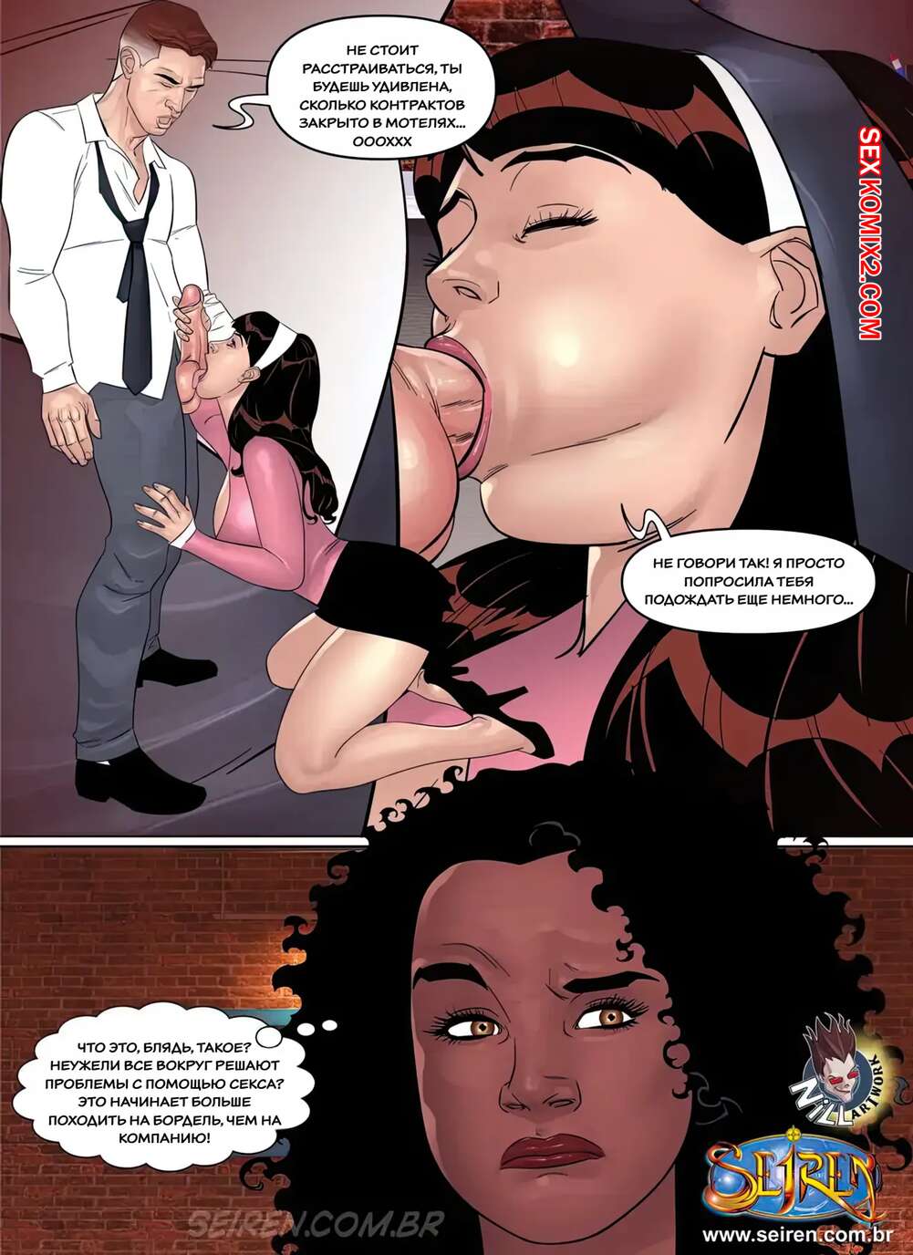 Порно комикс Дочерняя компания Лиcандры. Часть 1. Эпизод 2. Lisandra Subsidiary. Seiren Темнокожая брюнетка увидела через окно свою коллегу в кабинете у босса. Горячая милфа встала на колени перед начальником и отсосала его большой хуй, после чего дала ему себя выебать.