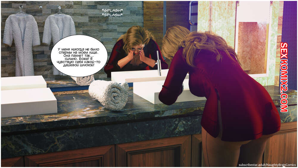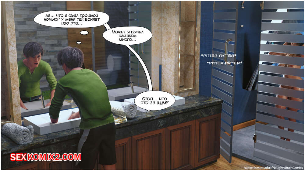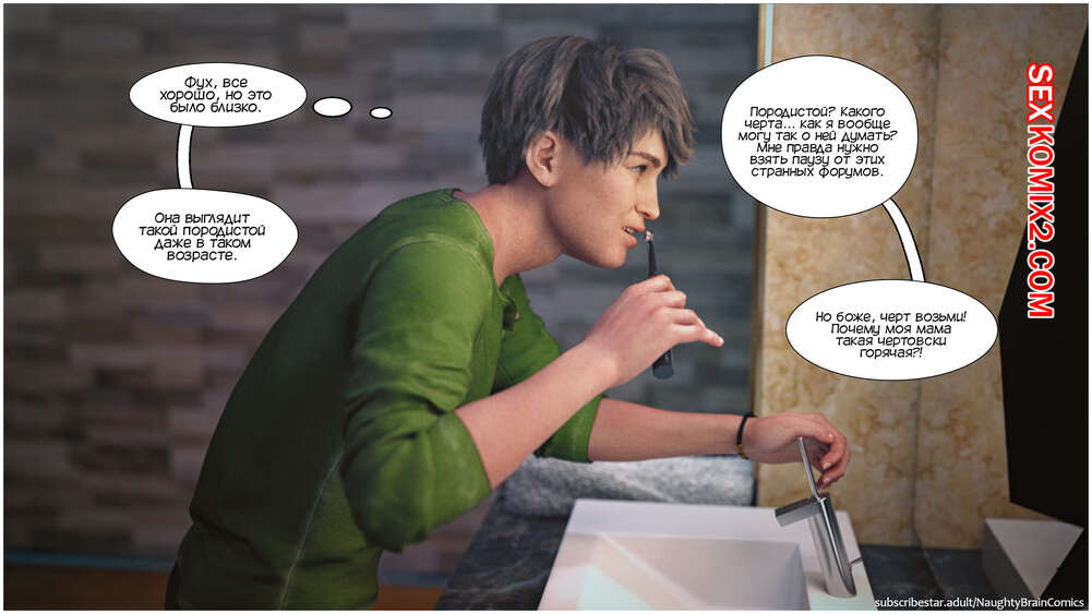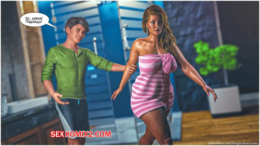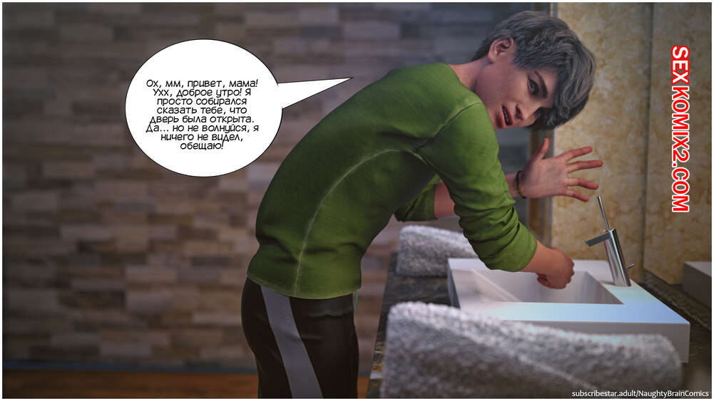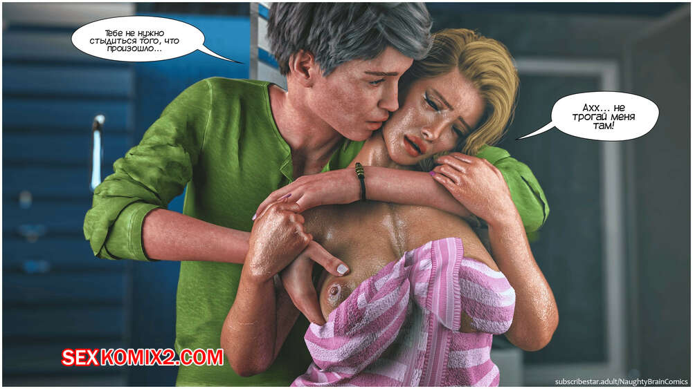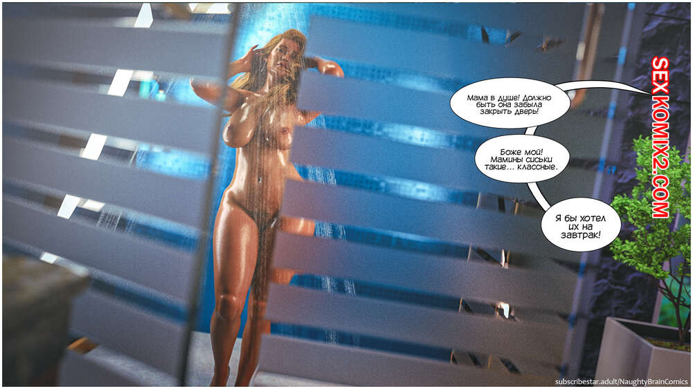 Порно комикс Возвращение домой. Часть 2. The Homecumming. NaughtyBrainComics Милфа застала своего сына спящим голым и его член стоял. Красотка стала дрочить его своей рукой и сперма парня быстро оказалась на ее лице. Мамочка пошла принять душ, чтобы смысть с себя сперму и расслабиться, а ее сын спалил ее голой во всей красе..