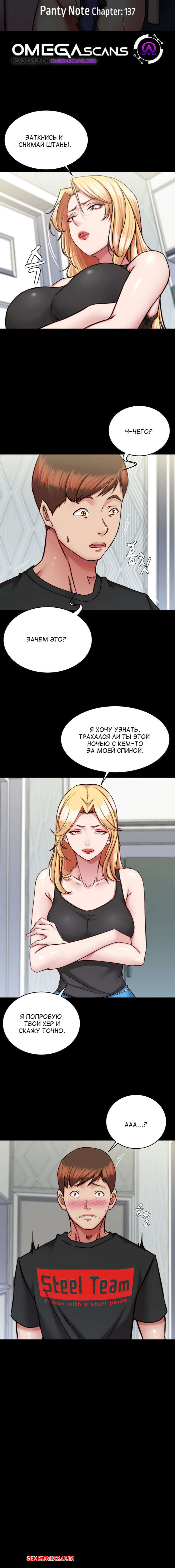 Порно комикс Тетрадь по трусикам. Часть 137. Panty Note Сексуальная блондинка милфа была очень возбуждена и хотела трахаться. Она разделась перед молодым парнем и стала у него отсасывать, после чего дала ему выебать свою пизденку.