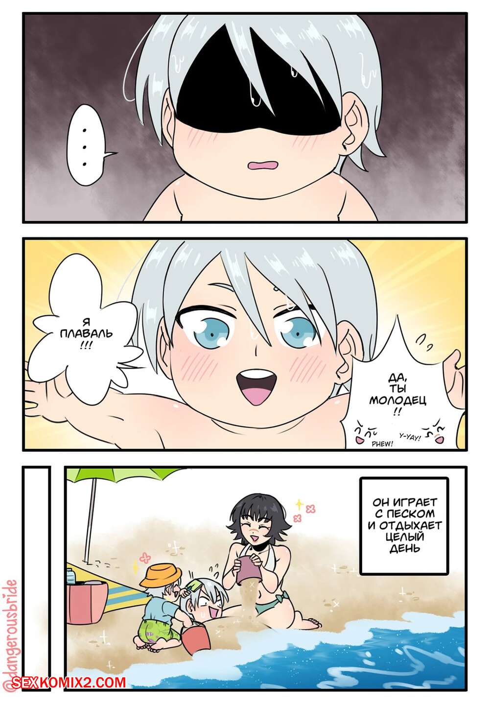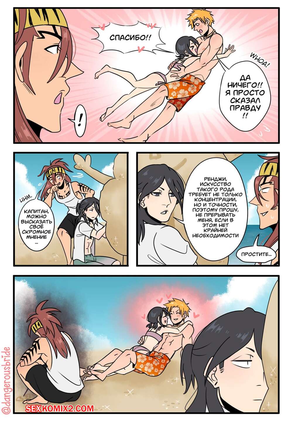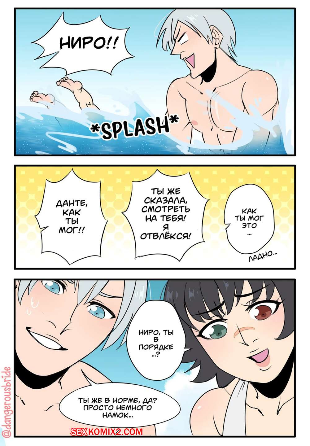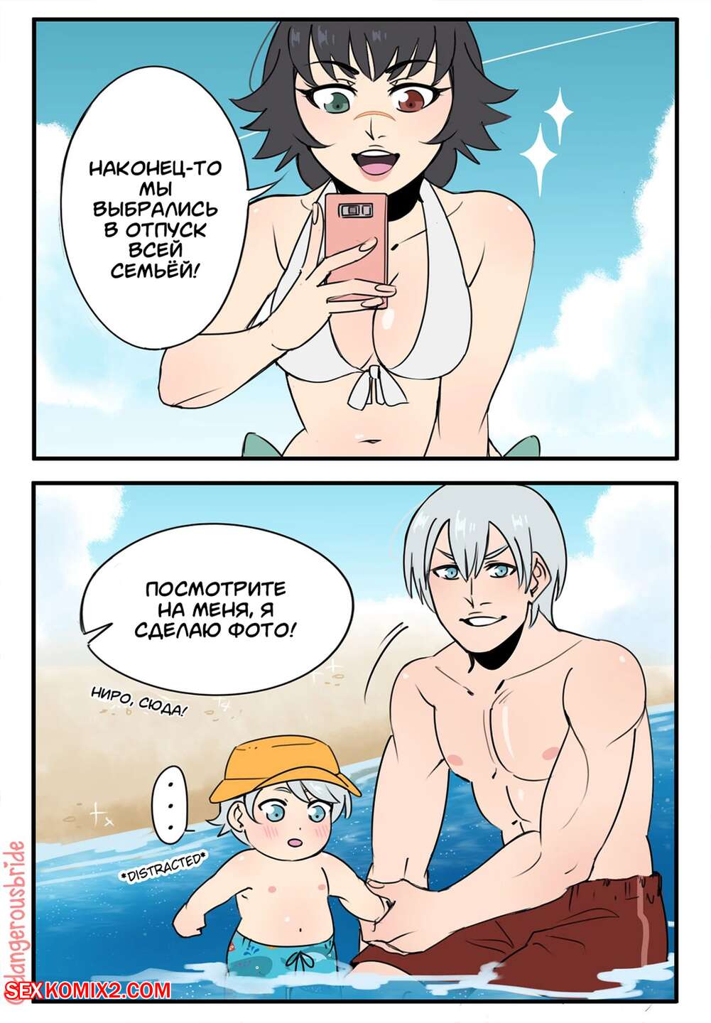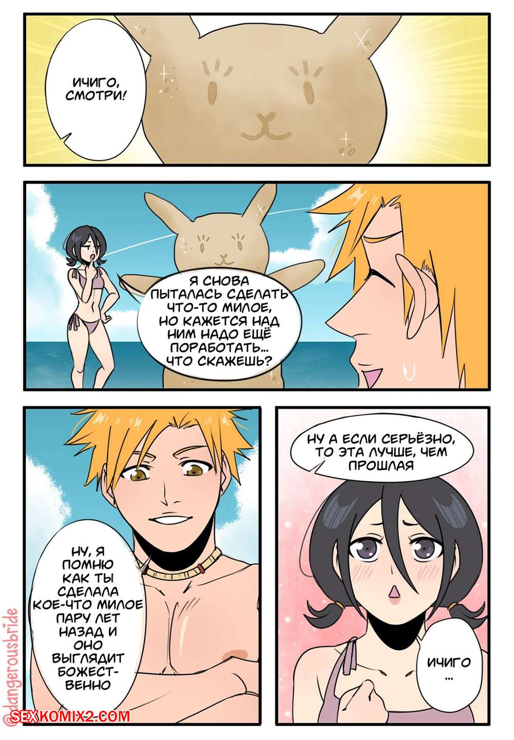 Порно комикс Жаркий пляжный день. Hot Beach Day. Dangerousbride. Горячая красотка отправилась на пляж со своим дружком, где решила с ним повеселиться. Красотка разделась и возбудила парня шикарным телом, после чего дала ему себя выебать.