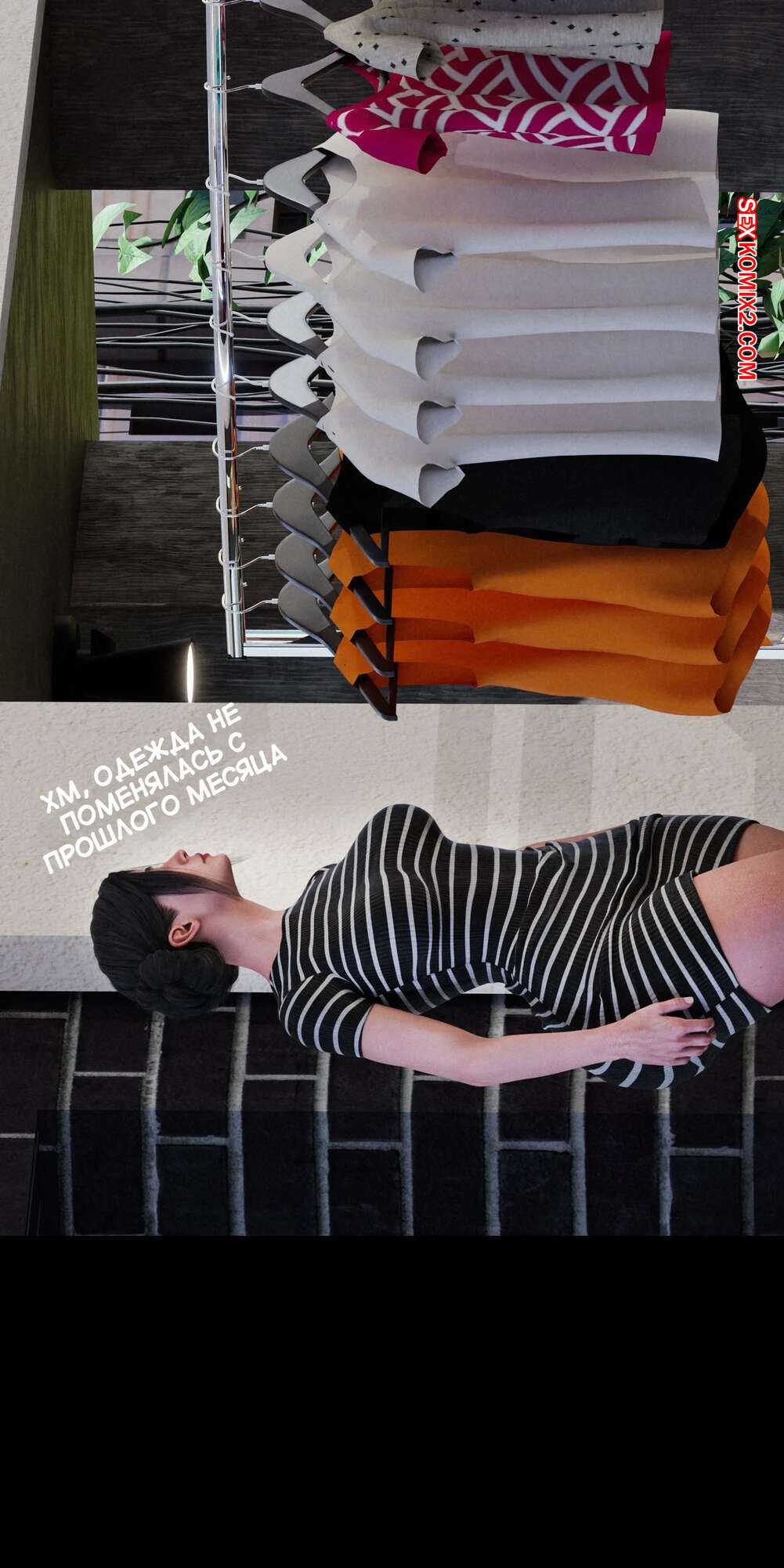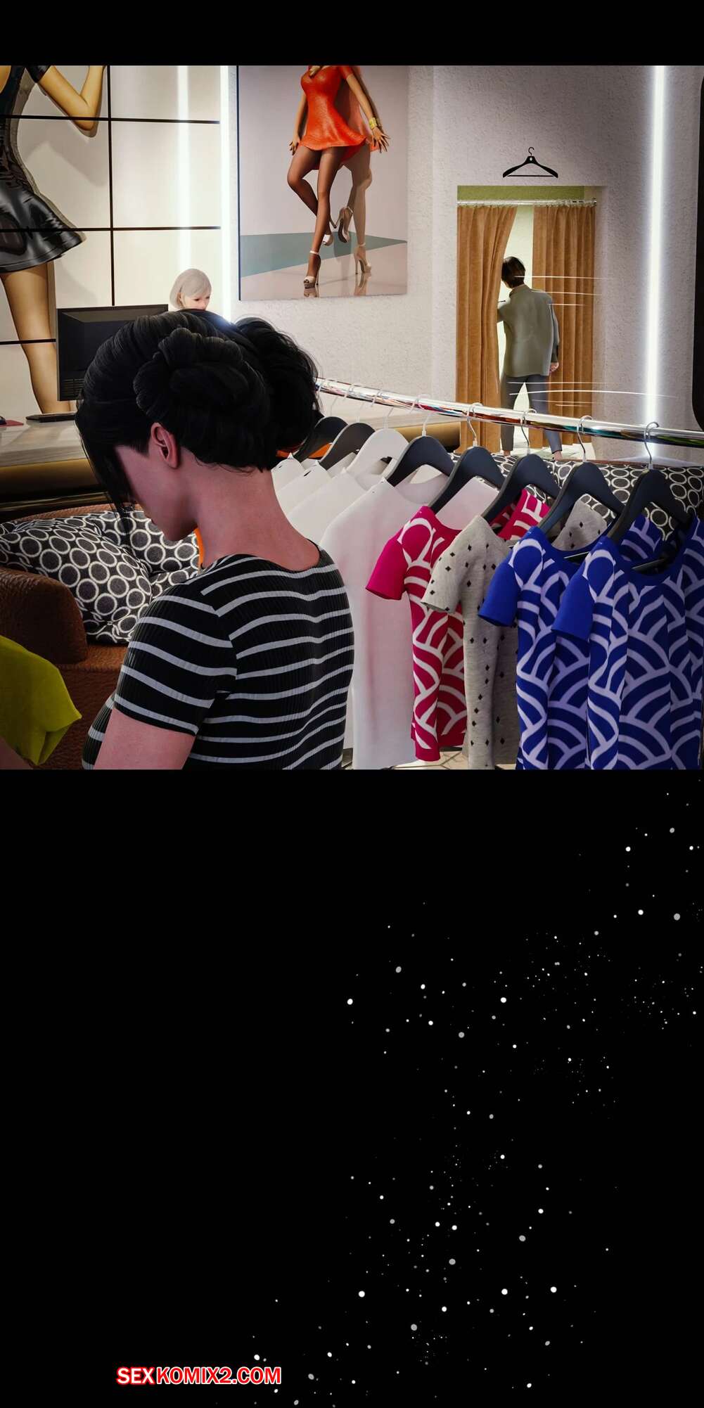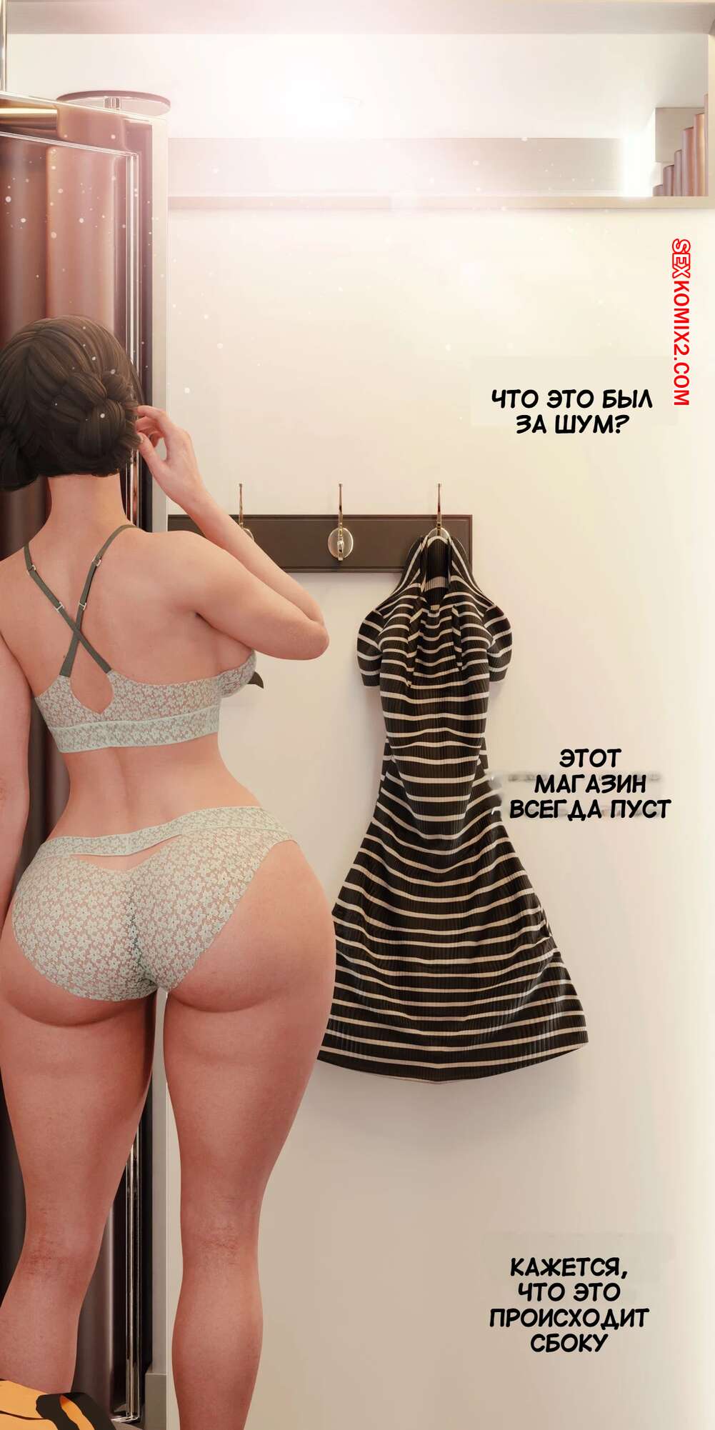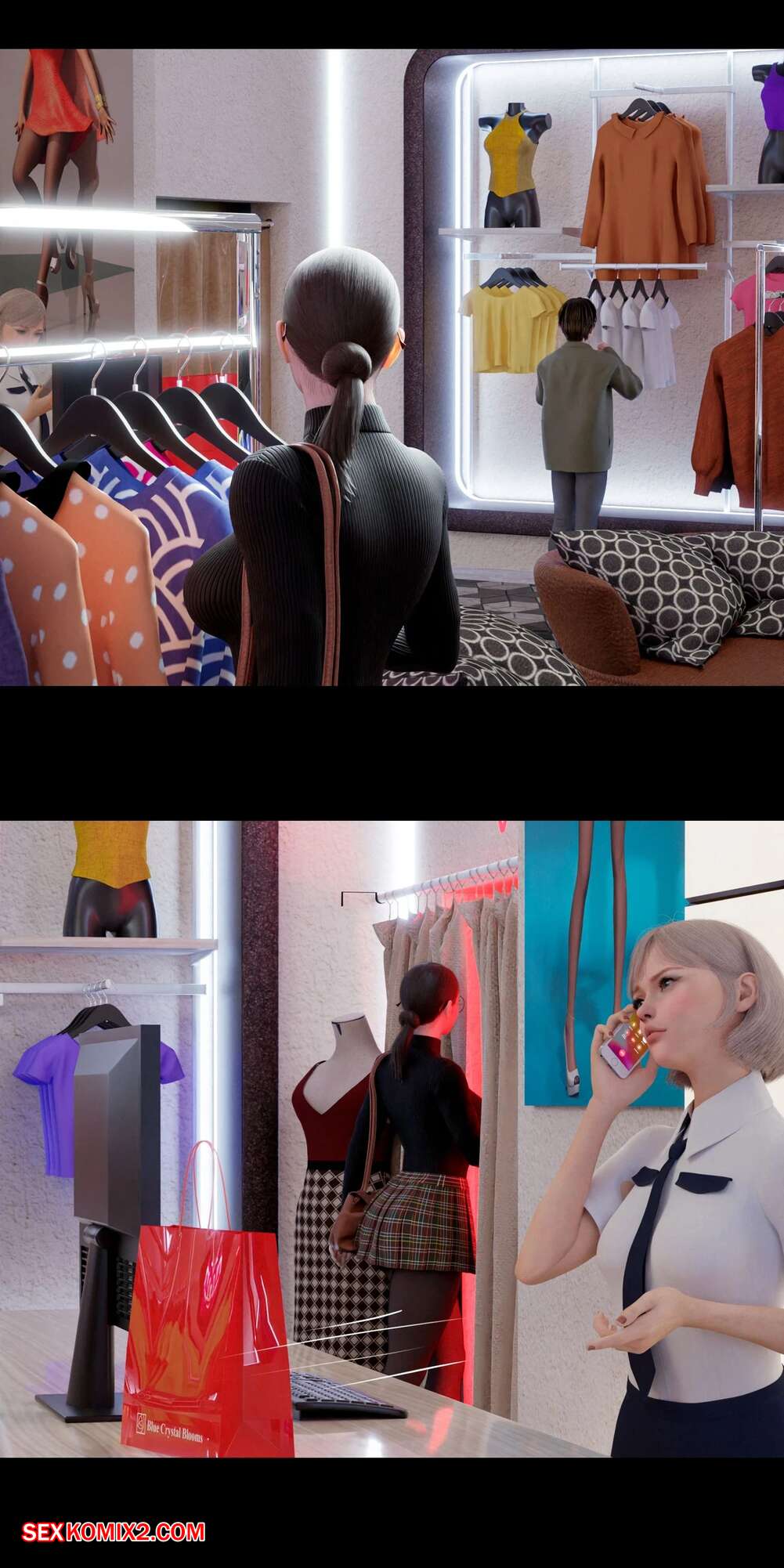 Порно комикс Моя соседская вдова. Часть 5. My Neighbors Widow. Rose Blue 3D. Сексуальная брюнетка пригласила парня пройтись с ней по магазинам. Девушка примеряла сексуальный наряд и попросила парня оценить как он выглядит. В примерочной девушка стала целовать своего спутника, желая заняться с ним сексом.