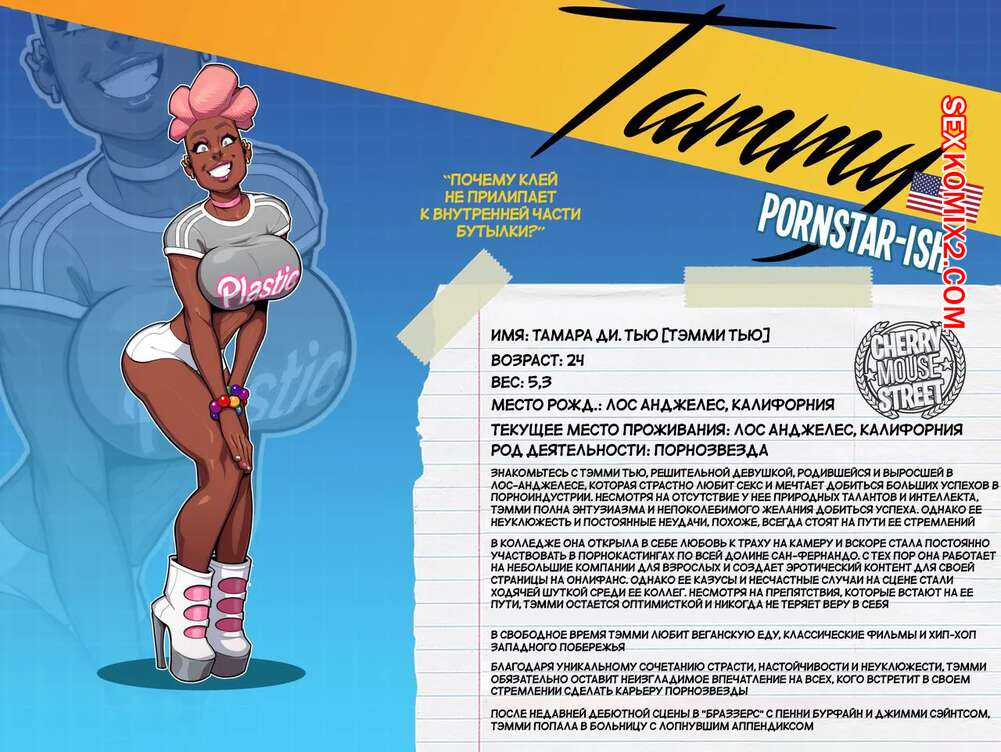 Порно комикс Тэмми Тью. Tammy Tew. Cherry Mouse Street Горячая темнокожая красотка обожает трахаться. Она встречается со своими дружками с большими хуями и хорошенько у них отсасывает, после чего дает им себя выебать во все дырочки.