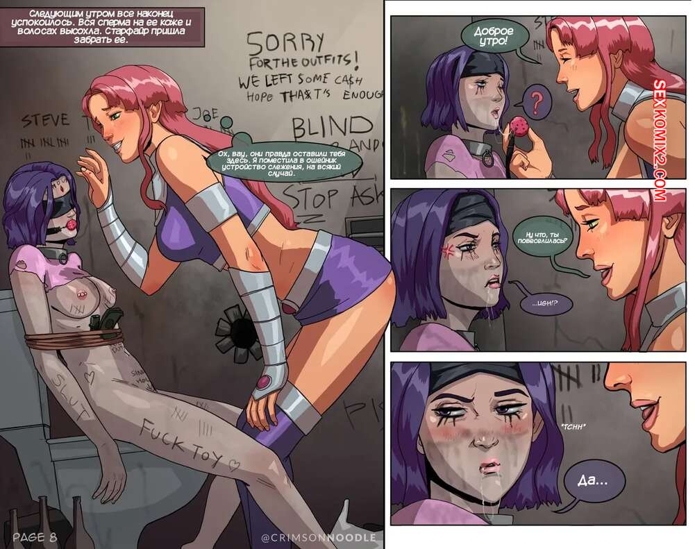 Порно комикс Teen Titans. Рейвен и Старфайр. Raven x Starfire. Crimson Noodle Старфайр осталась наедине с Рейвен и решила с ней повеселиться. Она раздела подругу и стала ласкать ее пизденку, после чего связала девушку и оставила ее в бесплатное пользование для парней.
