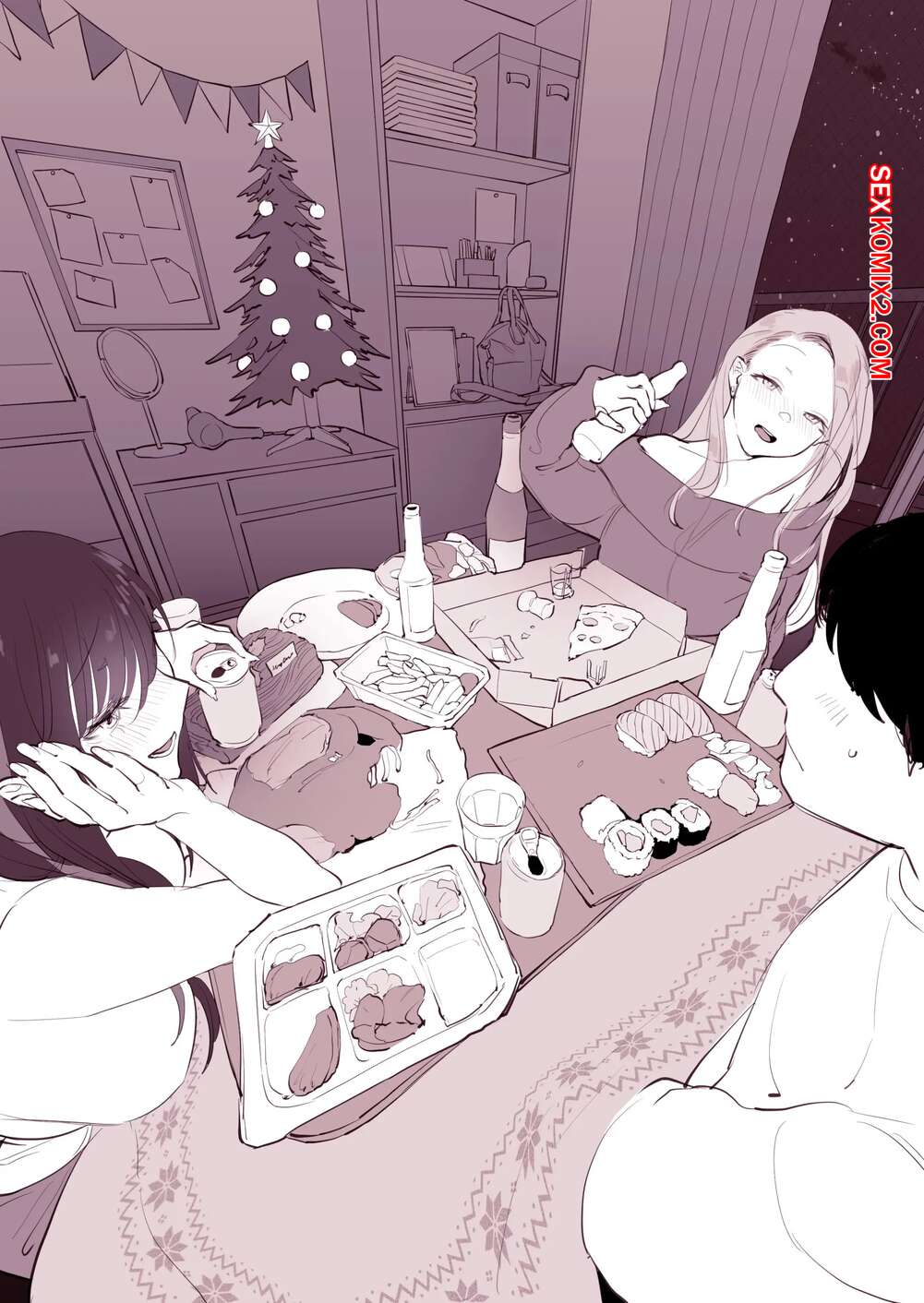 Порно комикс Выпивка на Рождество. Drinking at Home on Christmas. Poriuretan Горячие красотки выпивали на рождество со своим дружком и решили повеселиться. Девушки разделись и стали сосать хуй своего дружка, после чего дали ему себя выебать.