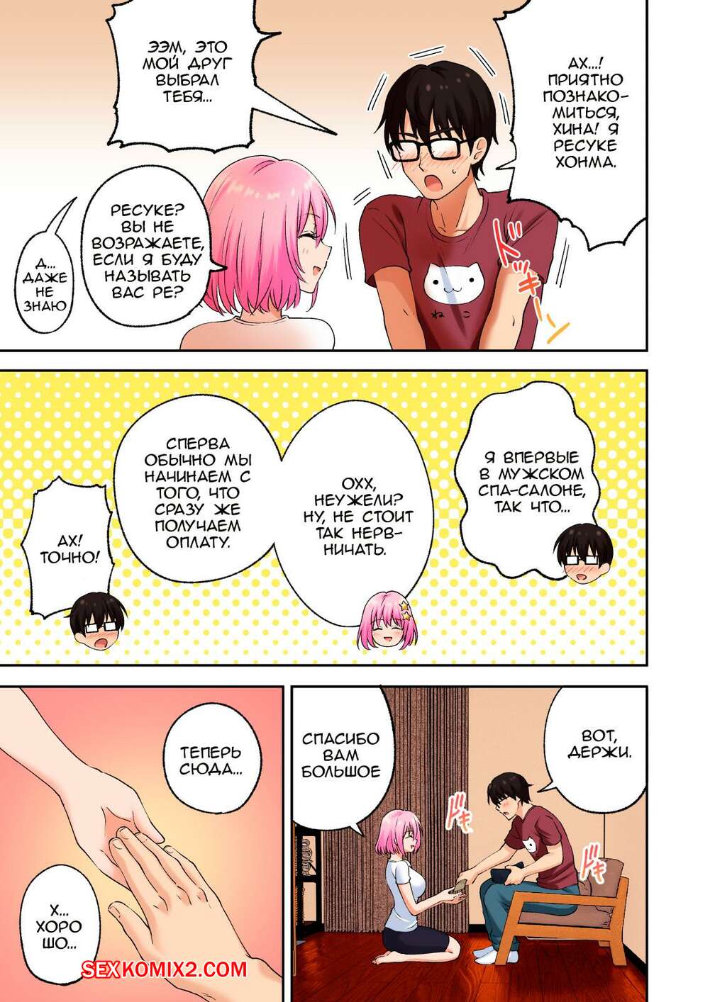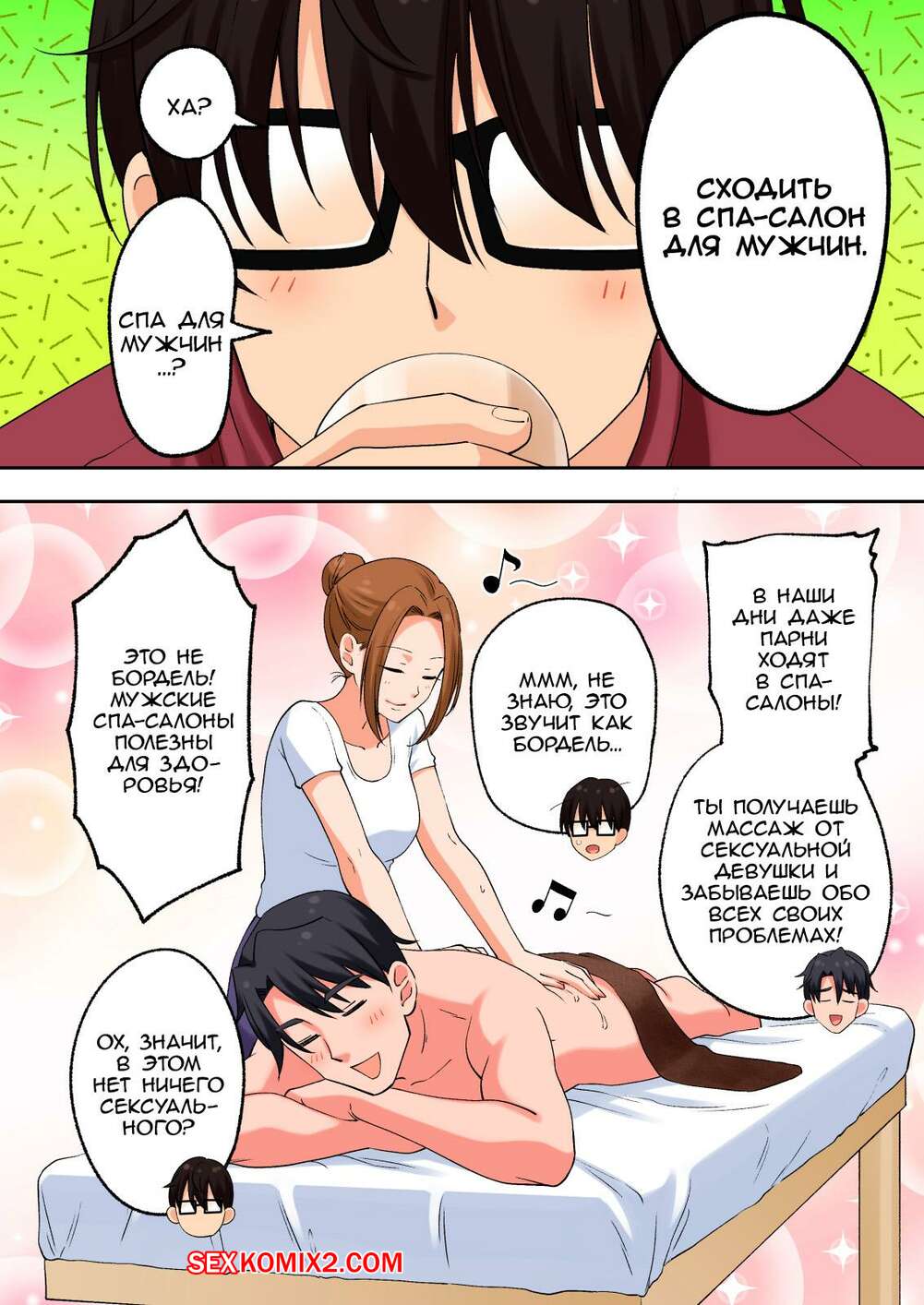 Порно комикс Спа салон для мужчин со счастливым концом. Ginyou Haru Парень встретился с горячей девушкой, чтобы она сделала ему массаж. Красотка разделась и стала ласкать парня, после чего отсосала хуй парня и дала ему себя выебать.