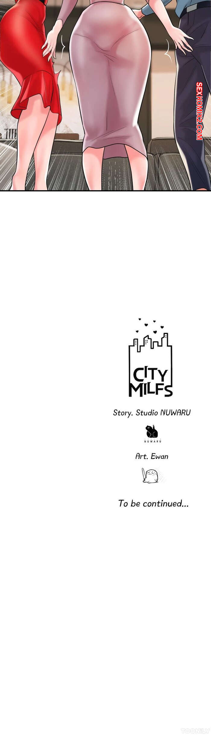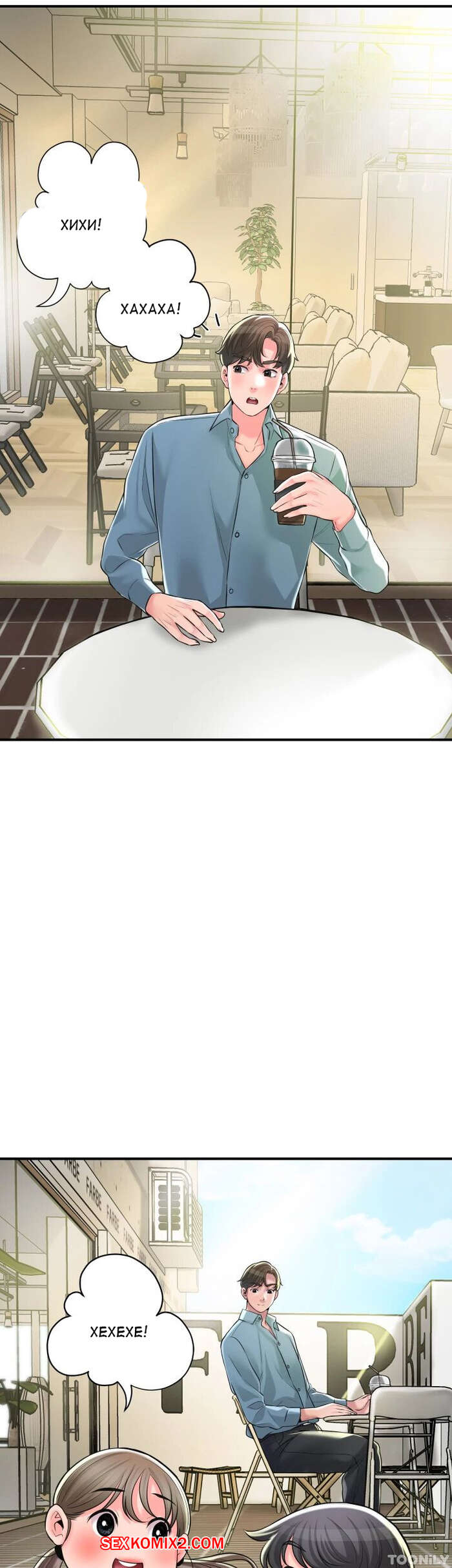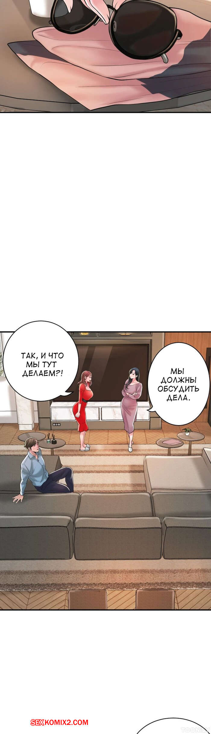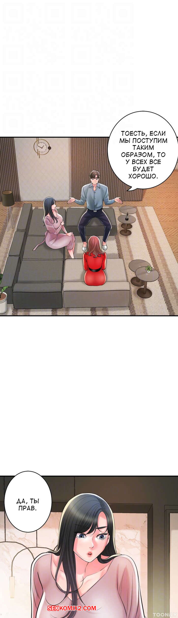 Порно комикс Новый город. Часть 102. New town Две горячие красотки пригласили к себе домой молодого парня. Они поговорили и гость собирался уходить домой, но одна из девушек его остановила и стала ласкать его член.