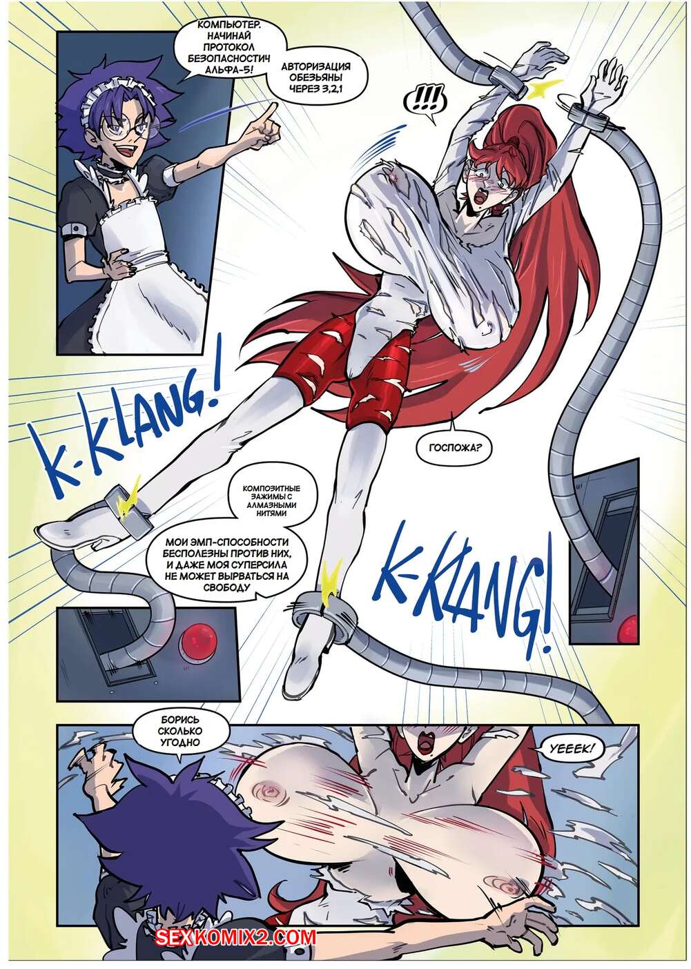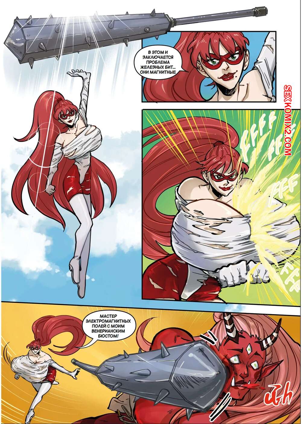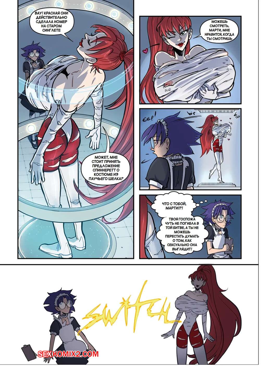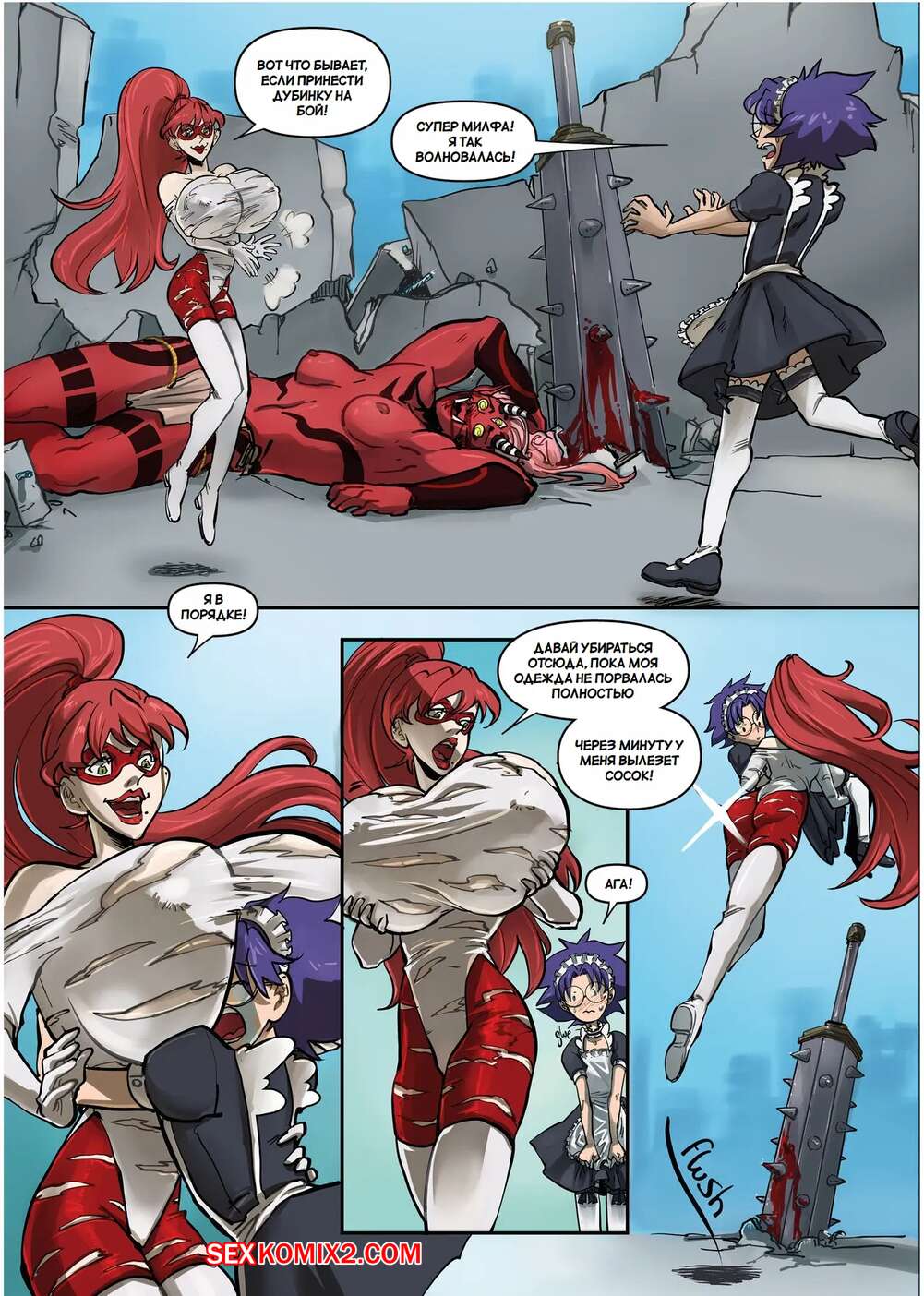 Порно комикс Супер милфа против Красного Они. Super MILF vs. Red Oni. Spinnerette Сисястая милфа супергероиня потерпела поражение в сражении и оказалась схвачена. Моментом решила воспользоваться юная девушка горничная, которая стала лизать киску пленницы, после чего ее выебала своим большим хуем.