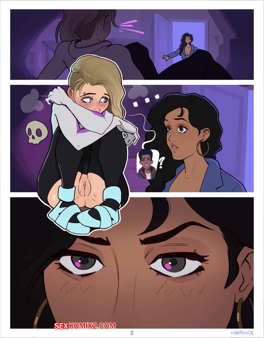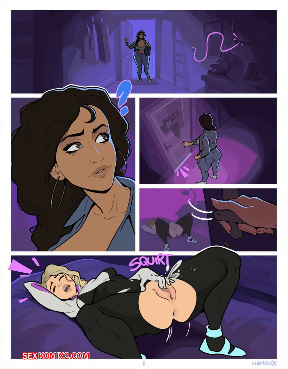 Порно комикс Spidermommy. Hornyx. Горячая блондинка Гвен осталась в комнате Майлза и стала ласкать свою пизденку, думая о парне. Стоны девушки застала Рио Моралез, которая стала подглядывать за подругой сына.