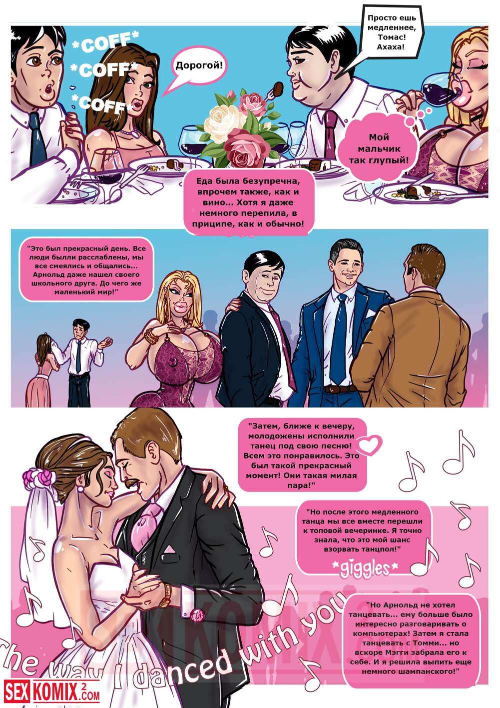 Порно комикс Тайная жизнь Сэнди. Часть 7. Свадьба. На свадьбе у дочери жена и муж так возбудились, что решили уединиться пока все празднуют. Они пошла в тихое место и блондинка сделал мужчине минет.