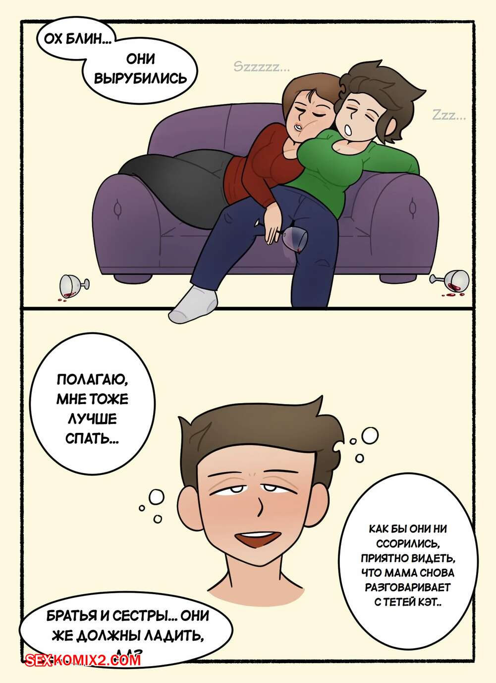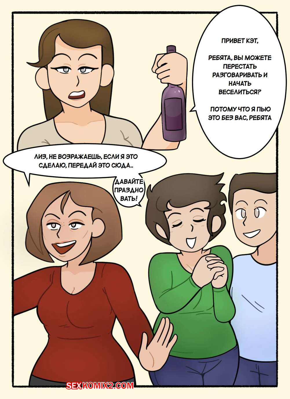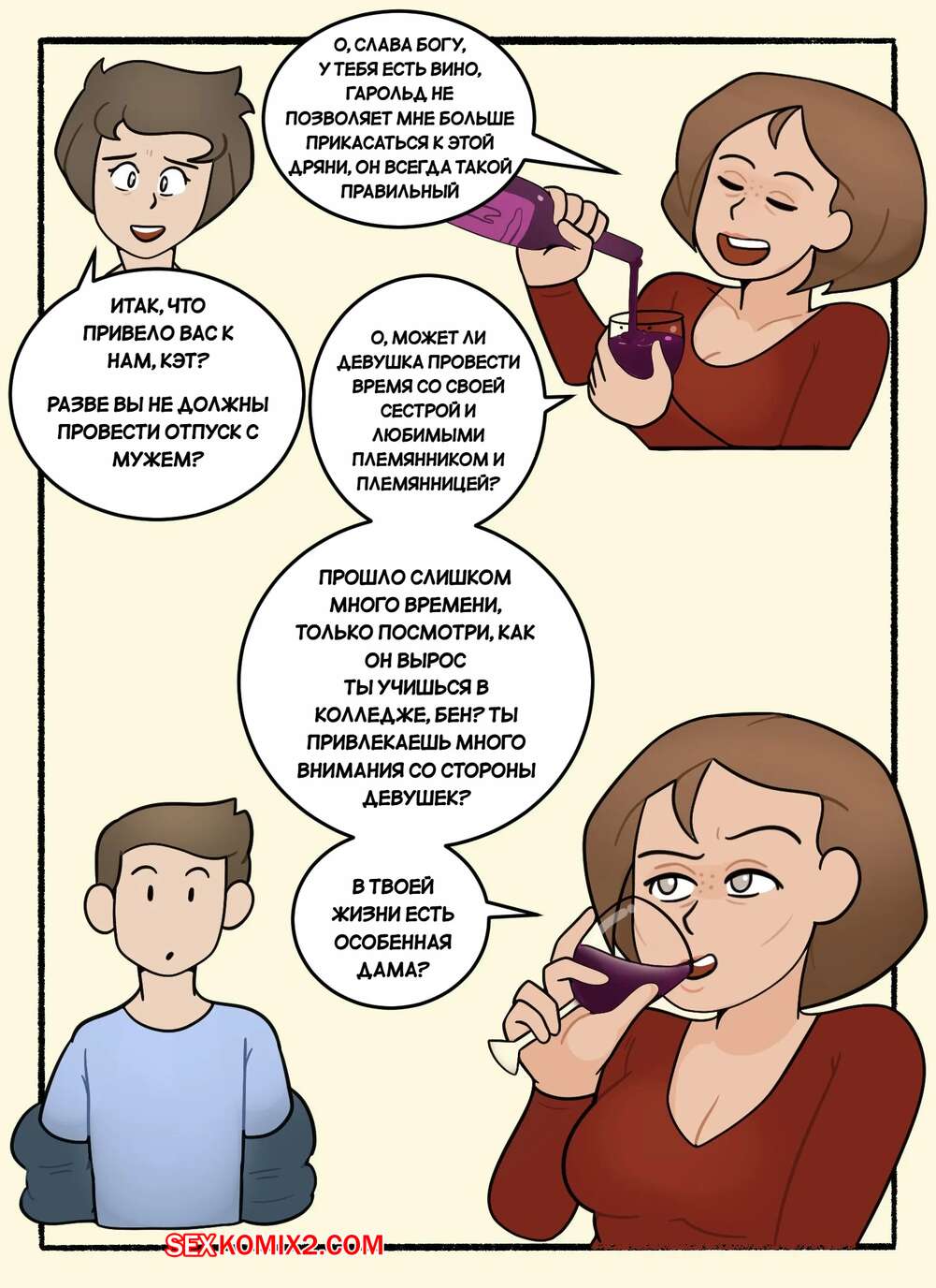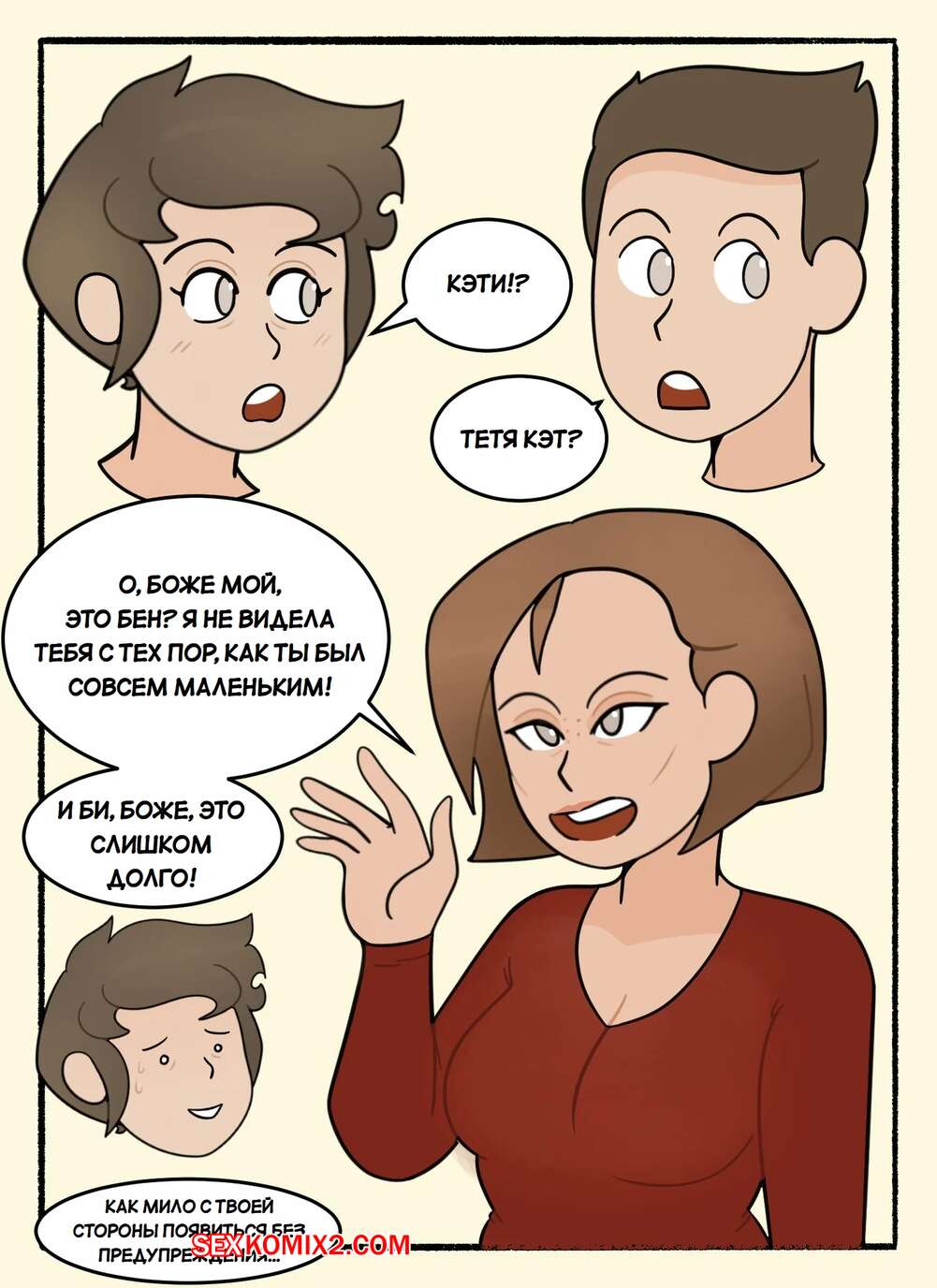 Порно комикс Неожиданный визит Кэти. Cathies Surprise Visit. DeadEndDraws. Кэти неожиданно приехала в гости к своей сестре и ее сыну. Красотки выпили вина, после чего решили повеселиться с молодым парнем. Они разделись и отсосали его большой хуй, после чего дали парню себя выебать.