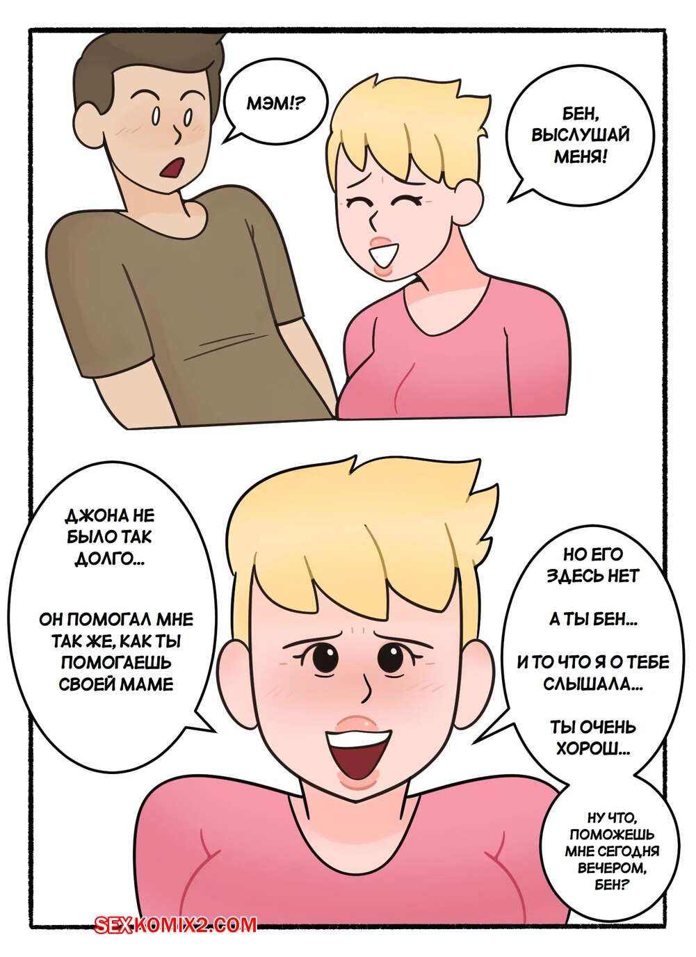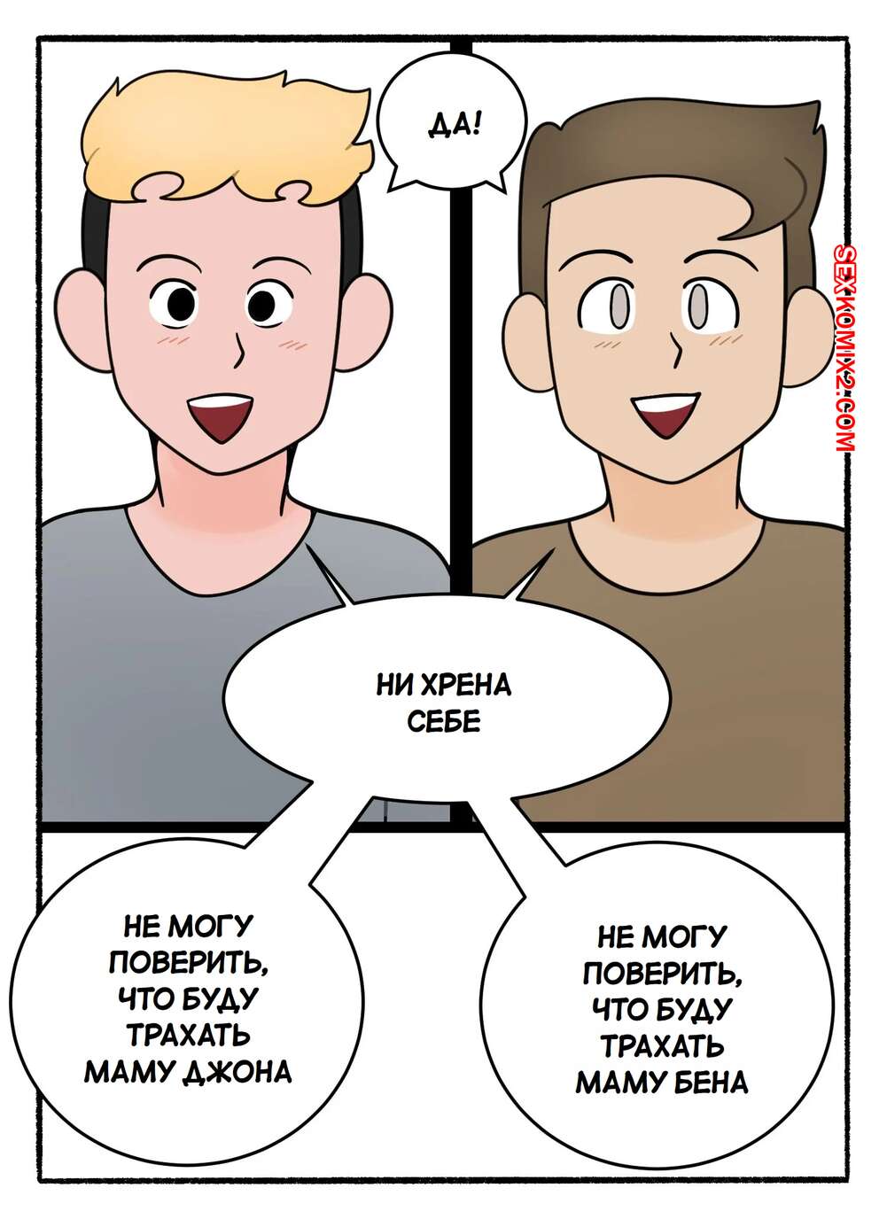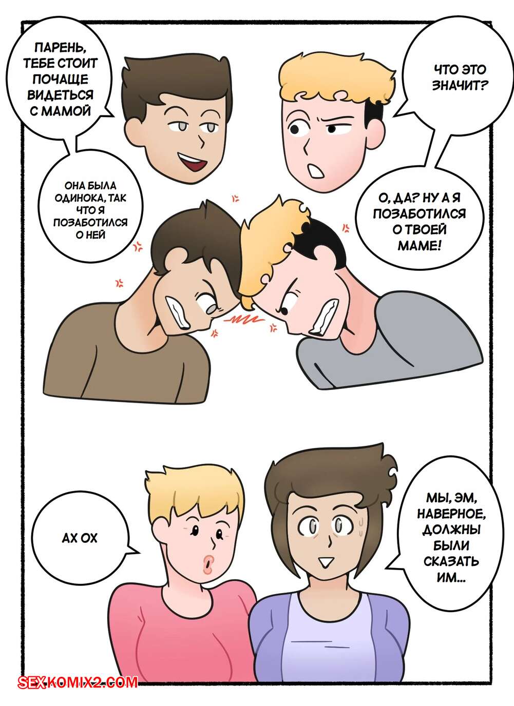 Порно комикс Обмен мамками. Swapping Moms. DeadEndDraws. Две горячие милфы по ошибке оказались наедине с сыновьями друг дружки и решили воспользоваться моментом. Красотки разделись и стали сосать большие хуи парней, после чего дали им себя выебать.
