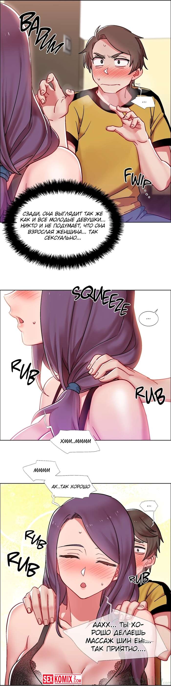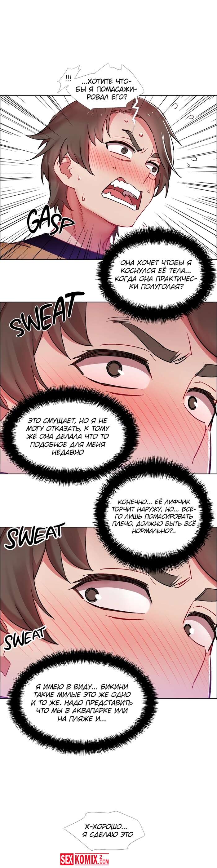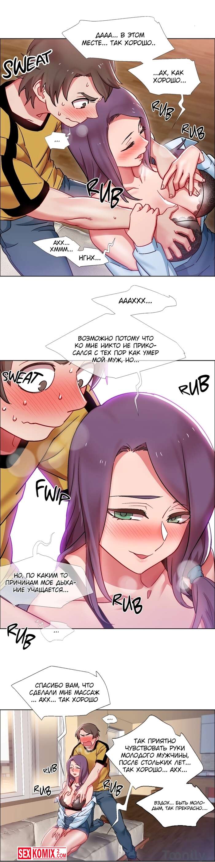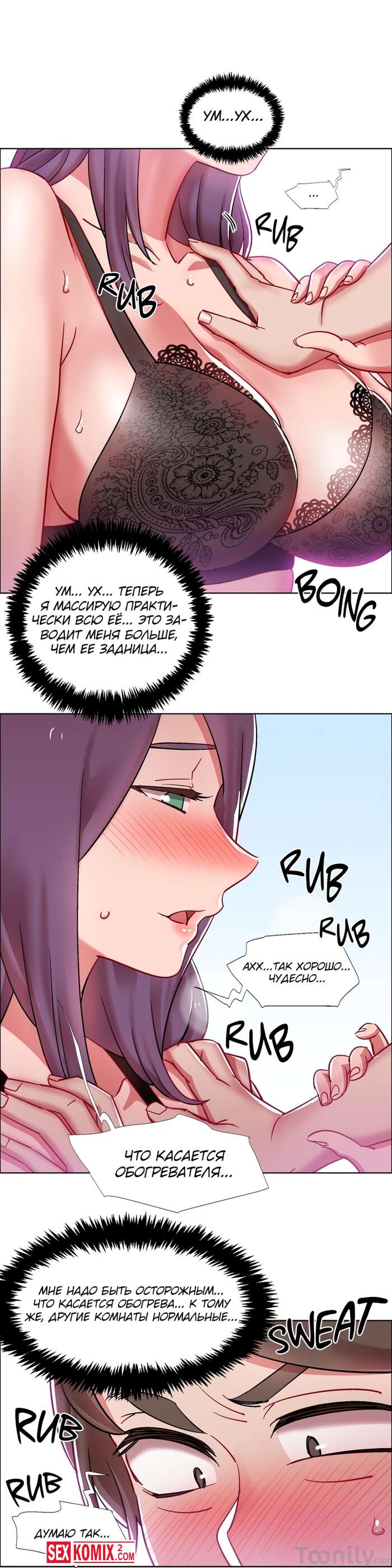 Порно комикс Прокат девушек. Части 27 и 28. Rental Girls. Девушка попросила сделать её массаж, так как спина совсем затекла. Но парень пошел дальше и начал трогать пышные сиськи.