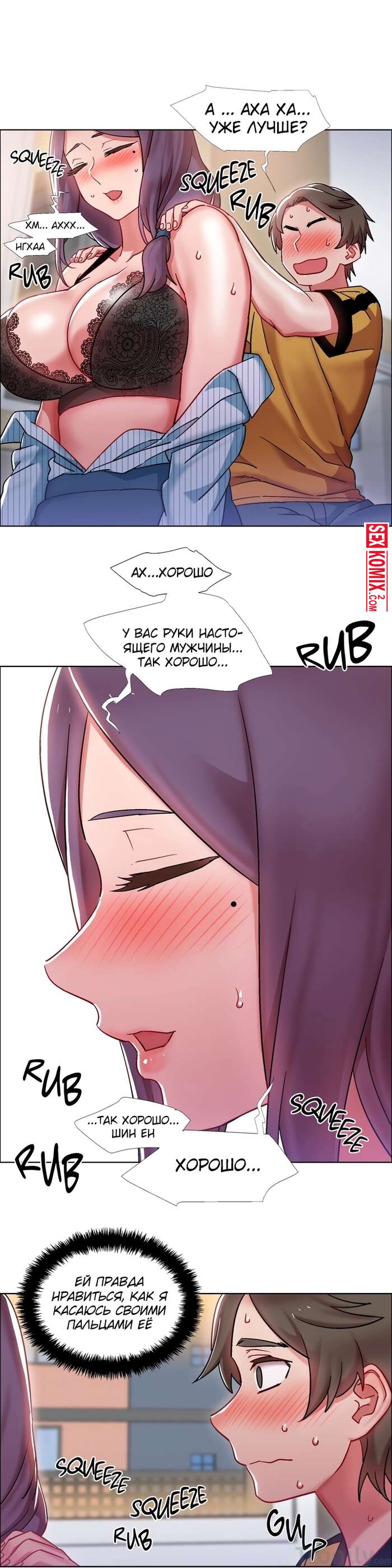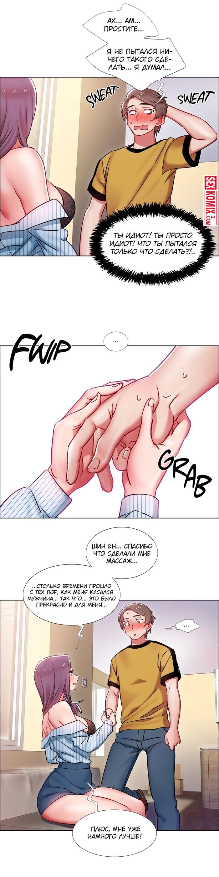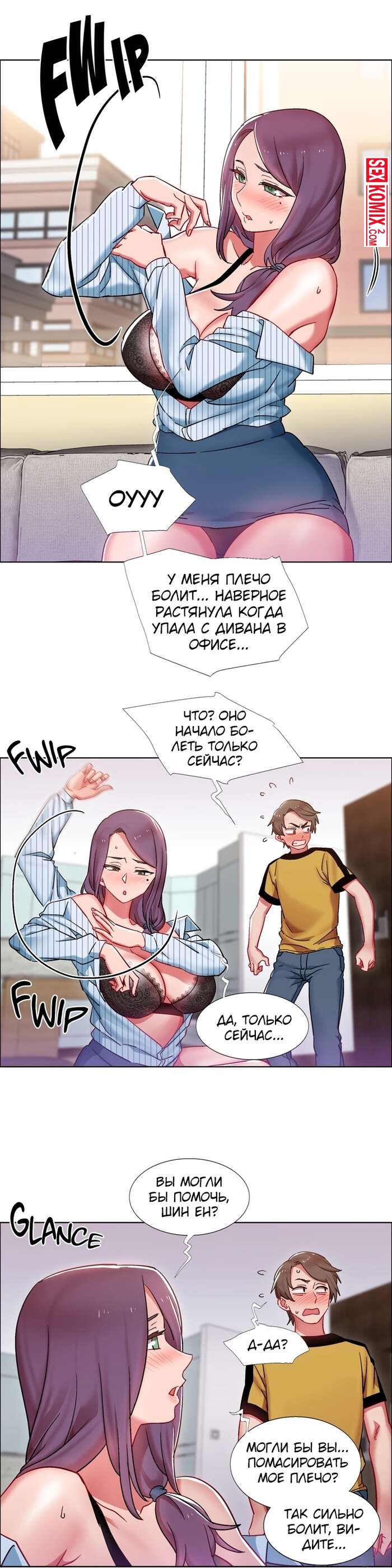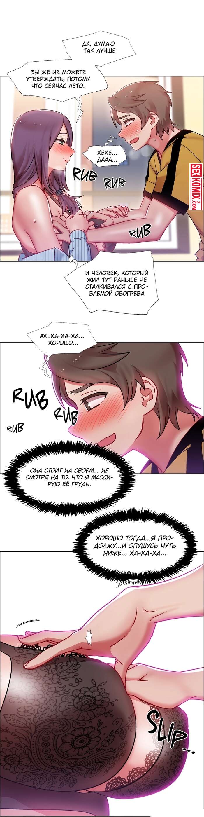 Порно комикс Прокат девушек. Части 27 и 28. Rental Girls. Девушка попросила сделать её массаж, так как спина совсем затекла. Но парень пошел дальше и начал трогать пышные сиськи.