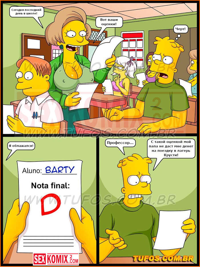 Порно комиксы Симпсоны. Часть 28. Каникулы в лагере Красти. Чтобы поехать в летний лагерь Барт должен получить хорошую оценку. Для этого он хорошо постарался со своей училки и она поставила ему высший бал.