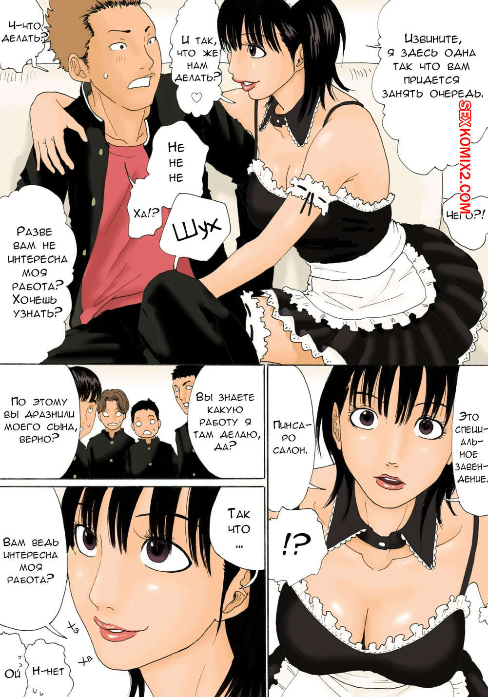 Порно комикс Пинсаро мама. Kiyokawa Nijiko Парни приходят в салон интимных услуг, чтобы повеселиться с сексуальной брюнеткой милфой. Она раздевается и сосет большие хуи парней, после чего дает им себя выебать.