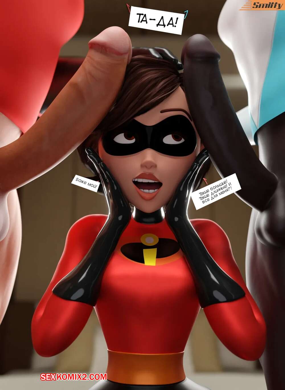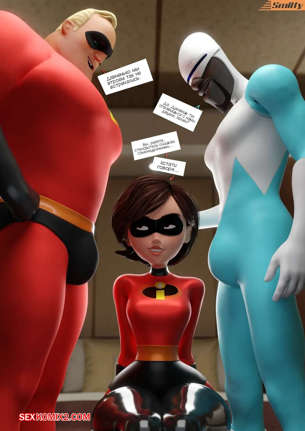 Порно комикс Суперсемейка. Между холодом и наковальней. Between a cold and a hard place. smitty34 Эластика осталась наедине со своим мужем и его другом Фреоном. Парни достали свои члены и красотка стала им отсасывать, после чего дала парням выебать себя во все дырочки.