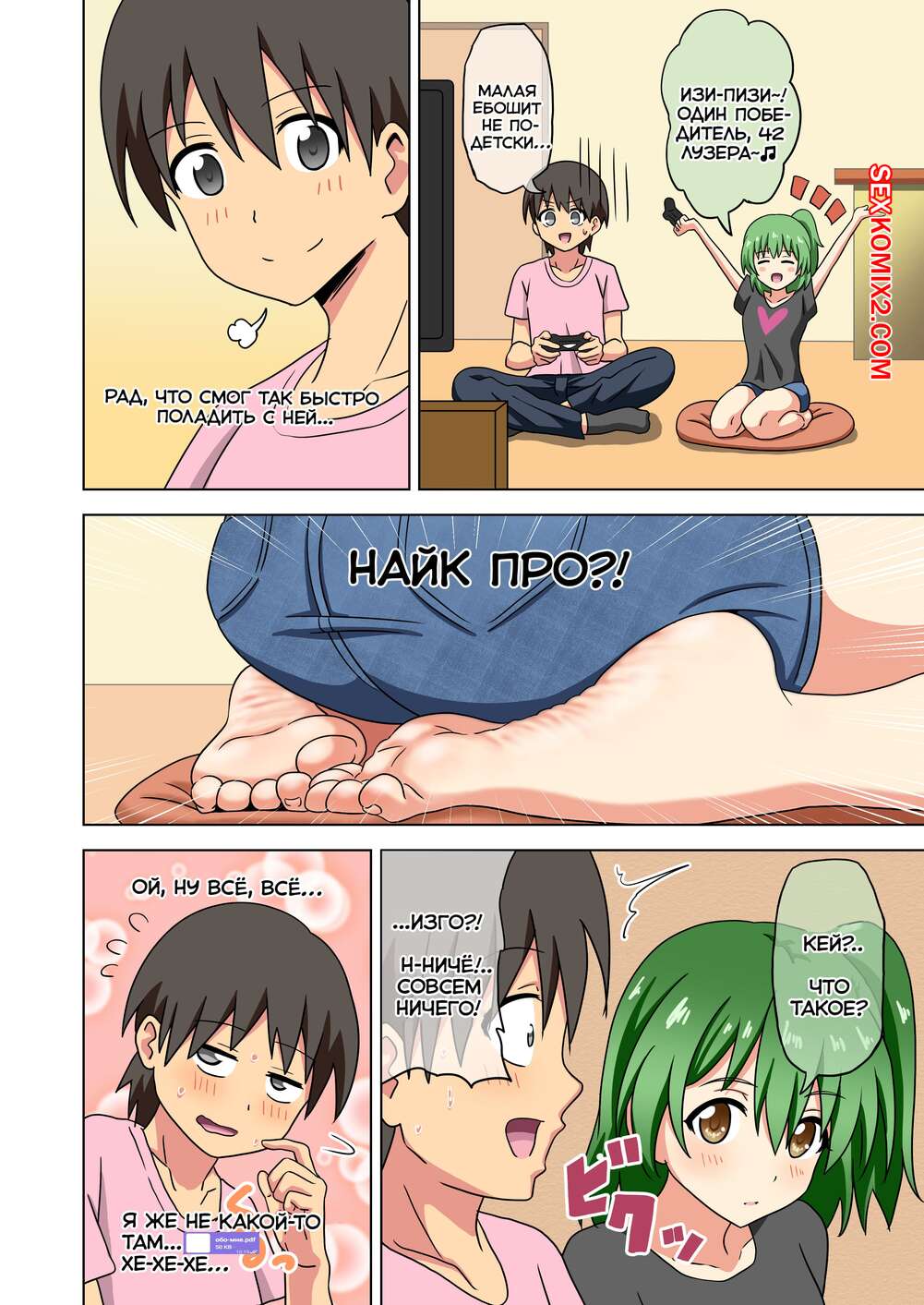 Порно комикс История футфетишиста. Часть 35. Nush Горячие красотки были очень возбуждены и решили повеселиться со своим дружком. Они заставили парня достать свой член, после чего стали дрочить его ножками.