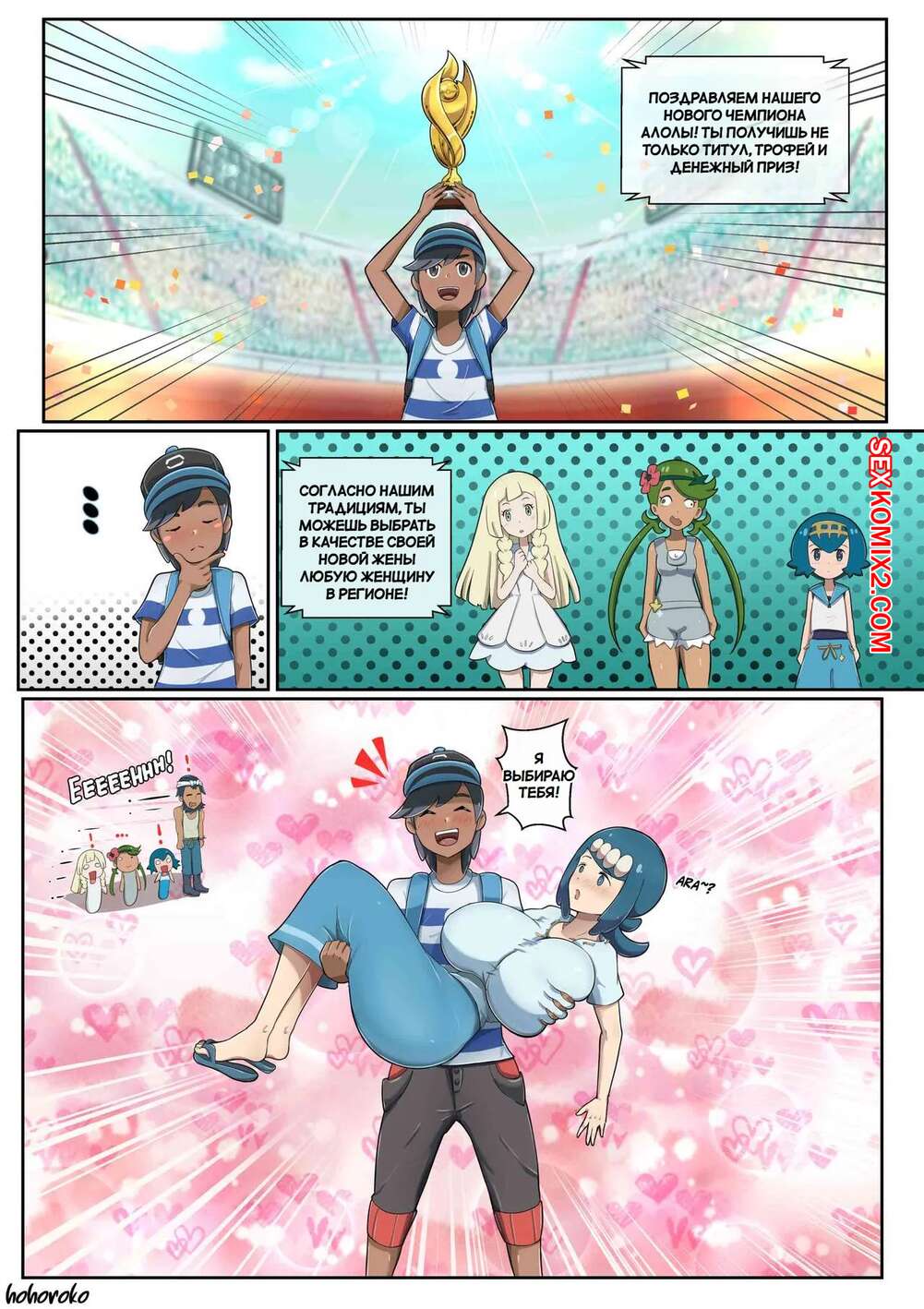 Порно комикс Леди Чемпиона Алолы. The Lady of the Alola Champion. Hohoroko. Парень одержал победу в турнире и получил возможность выбрать любую девушку. Он забрал сексуальную красотку к себе домой, где она отсосала его член и дала себя выебать.