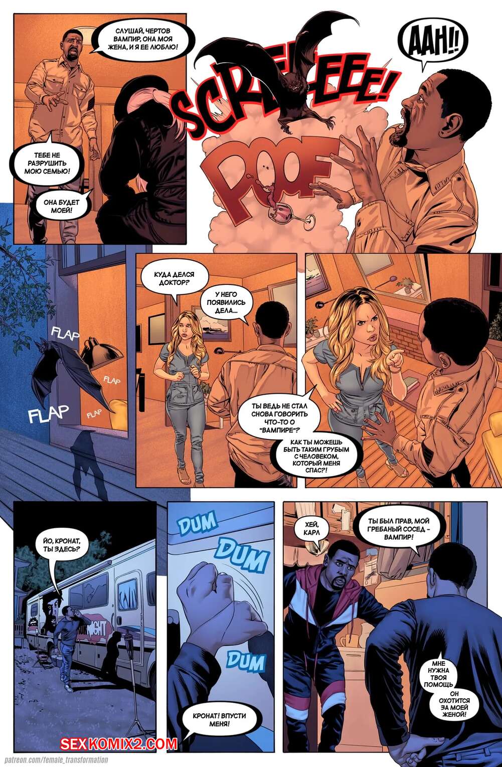 Порно комикс Новый выводок. A New Brood Темнокожий вампир похищает сексуальных красоток и кусает их, чтобы превратить их в себе подобных. Затем девушки сосут большой хуй парня, после чего он их как следует трахает.