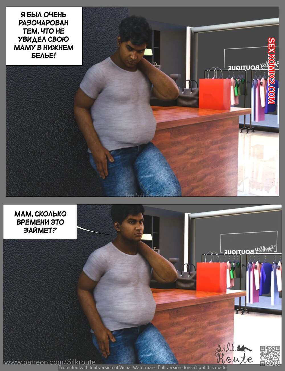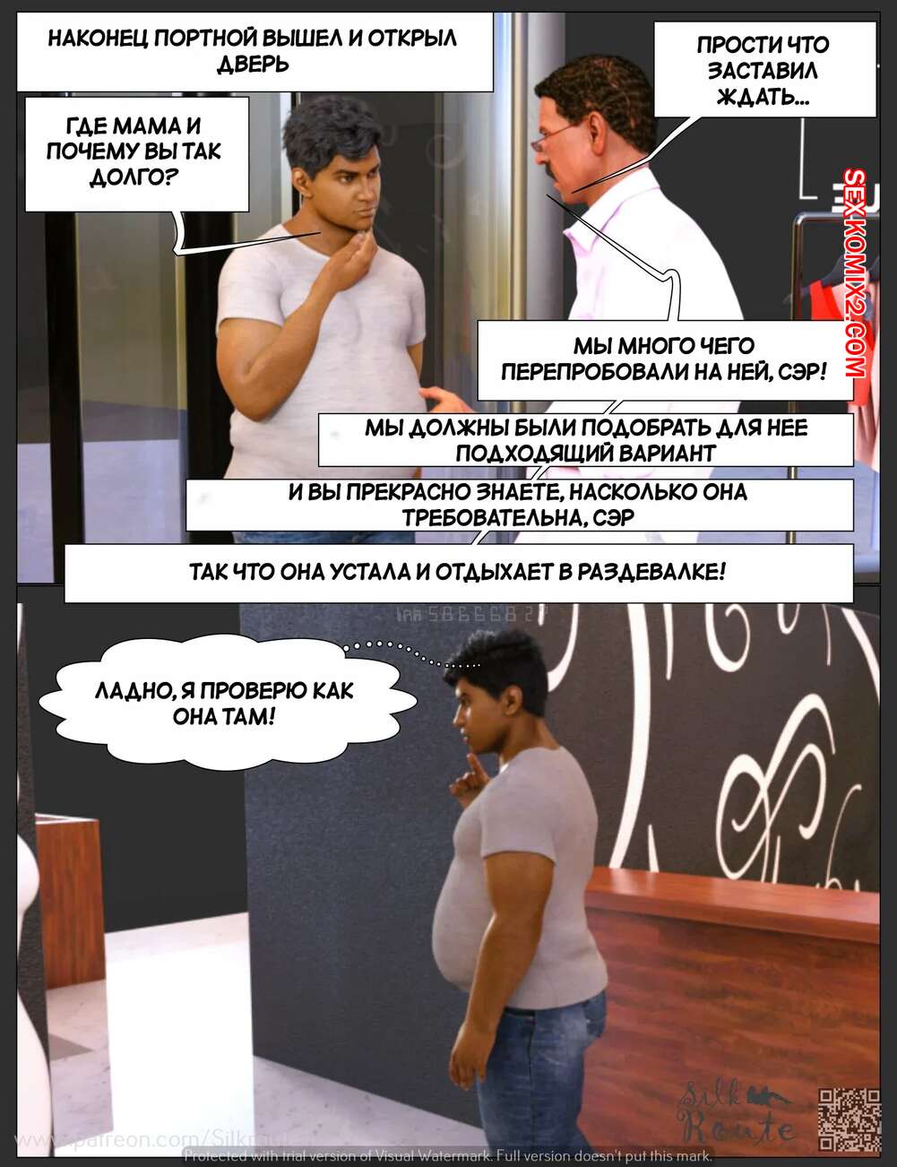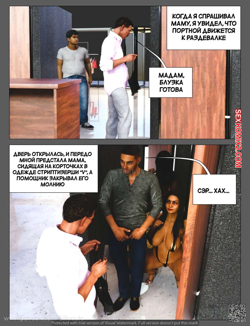 Порно комикс Тетушка Рани. Часть 3.2. Rani Aunty. Silk Route Горячая милфа была очень возбуждена и решила повеселиться с незнакомцем в примерочной. Красотка встала на колени и отсосала большой хуй парня, после чего дала ему себя выебать.