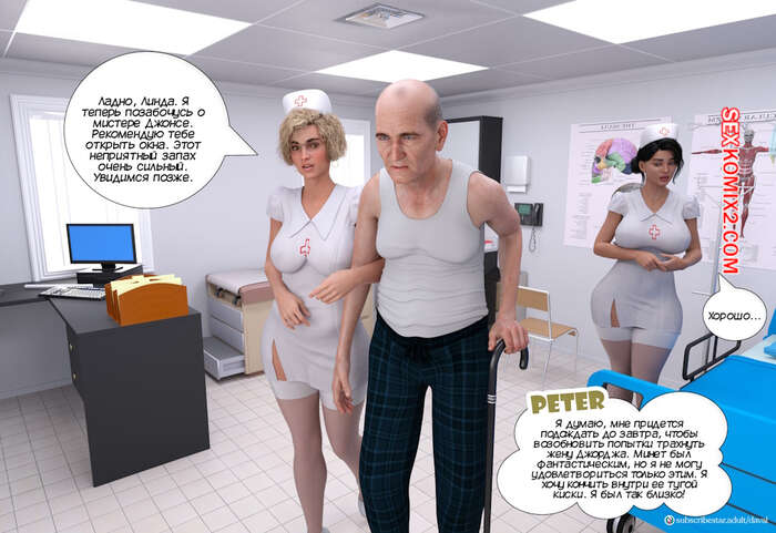 Порно комикс Питер. Peter. Daval3D Старик Питер проходит лечение в больнице, где за ним ухаживает сексуальная медсестра. Он подкатывает яйца к девушке и обещает помочь ей с мужем, если она удовлетворит его сексуальные позывы.