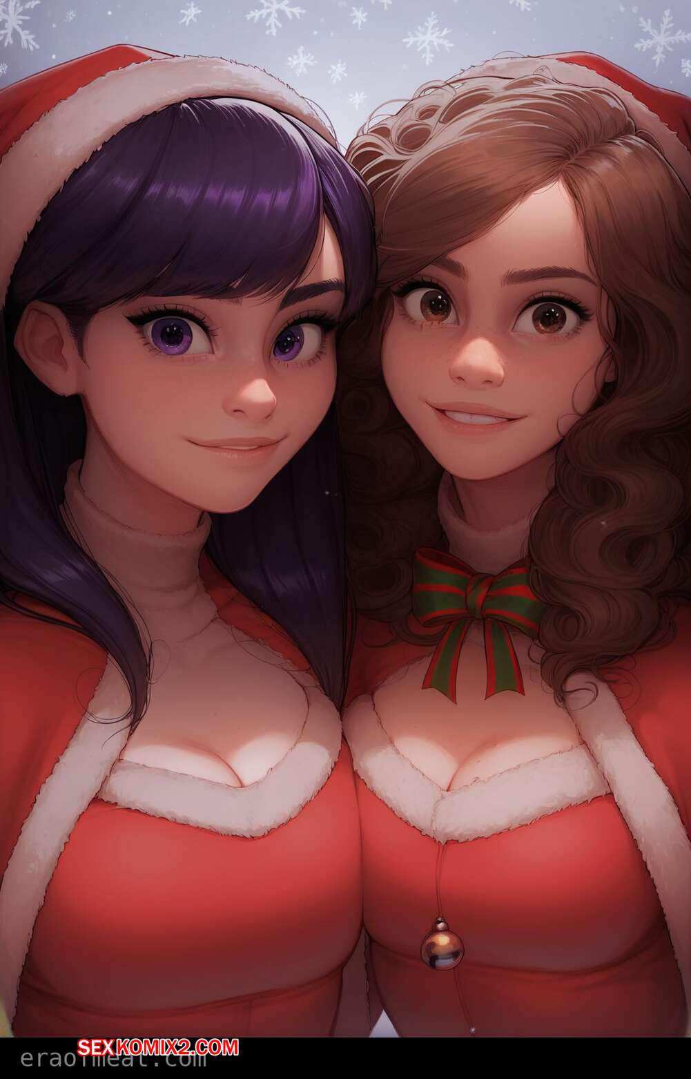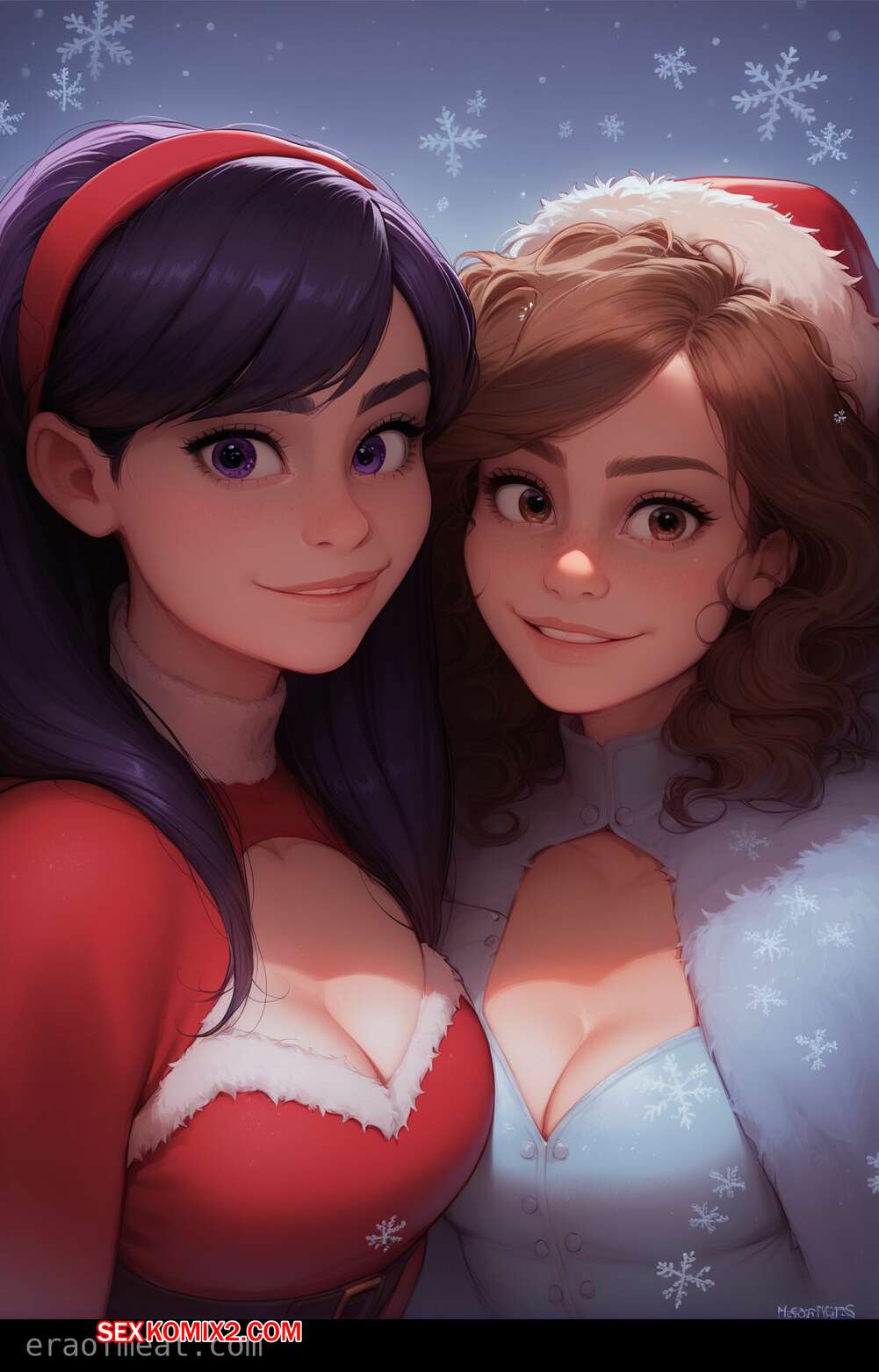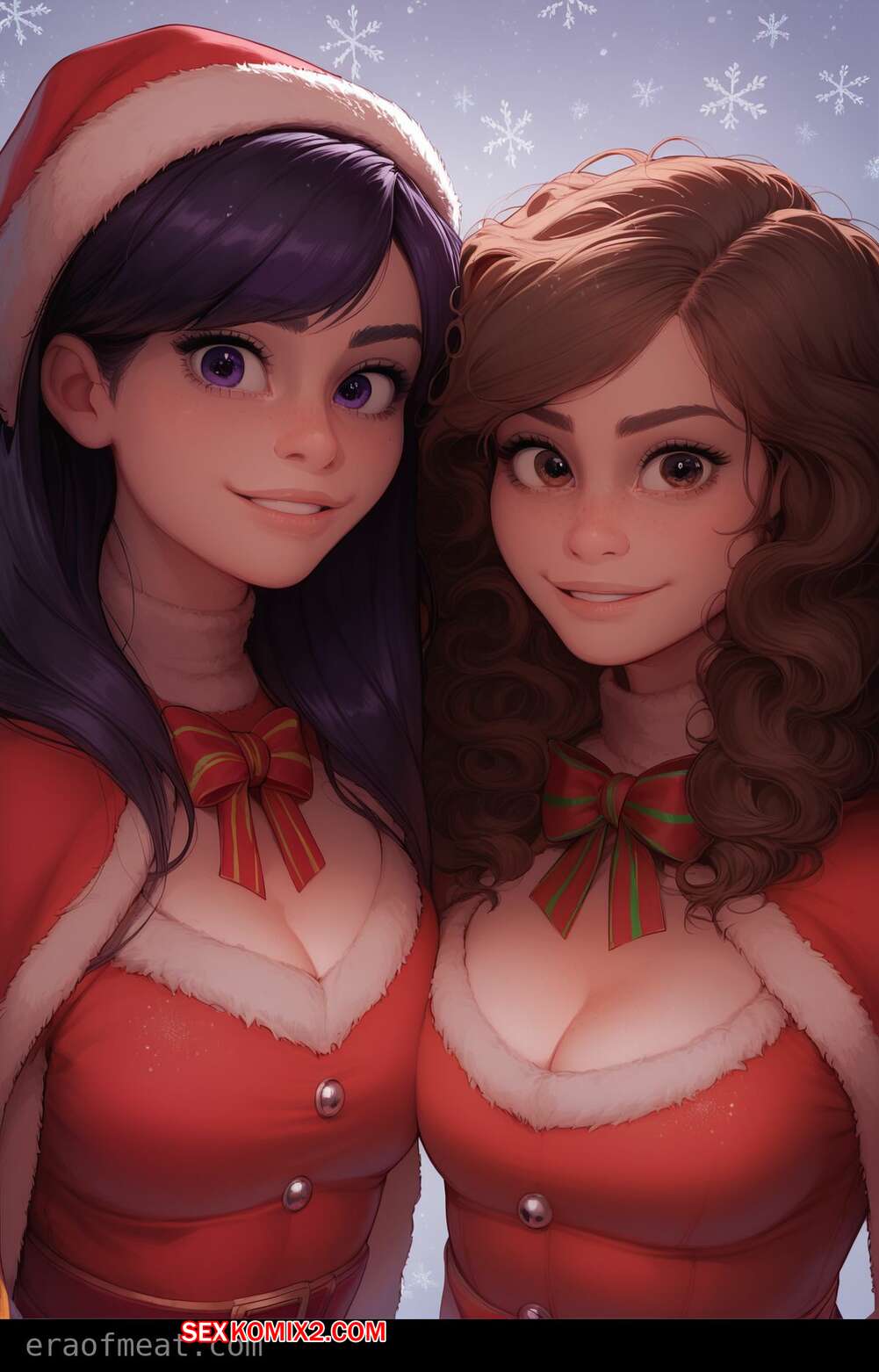 Порно комикс Hermione and Violet. Era of Meat Две горячие красотки очень возбуждены и хотят трахаться. Они раздеваются и ласкают друг дружку, после чего отсасывают большой хуй своего дружка, получая огромное удовольствие.