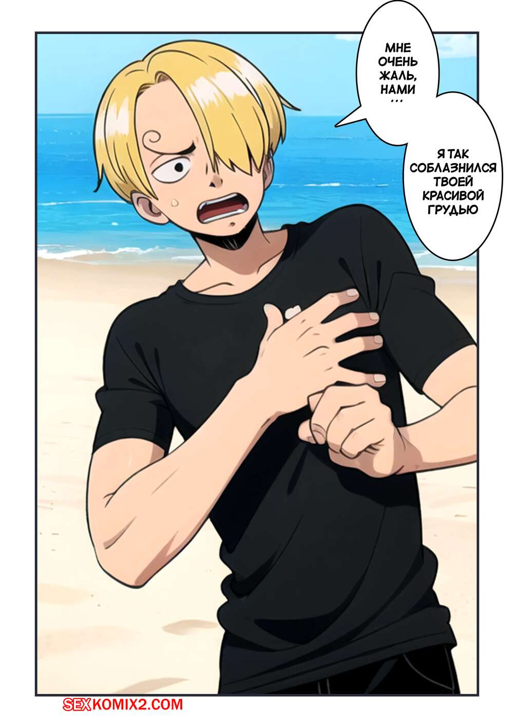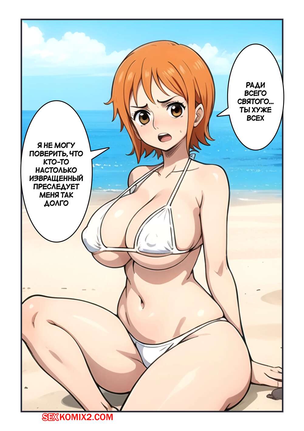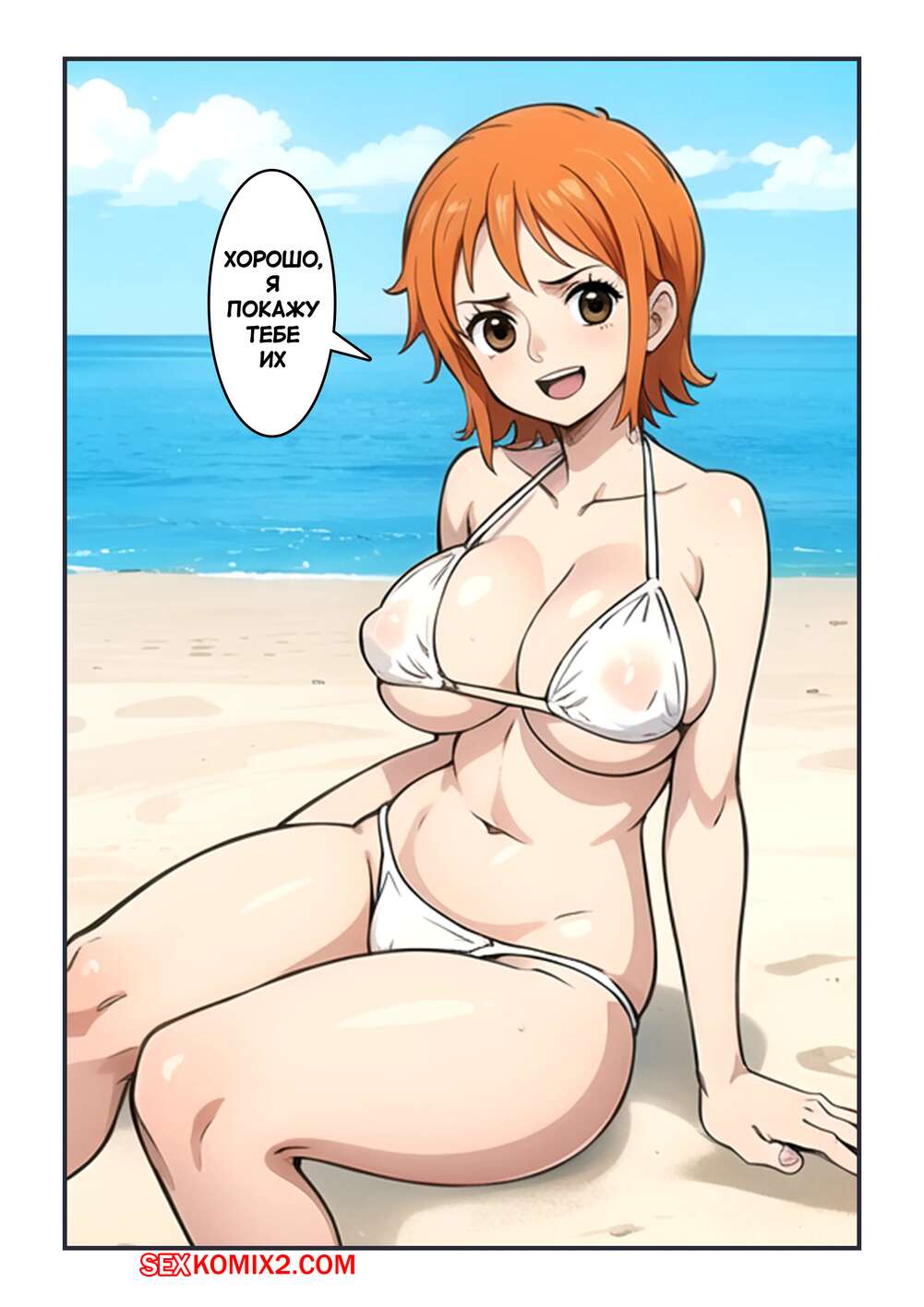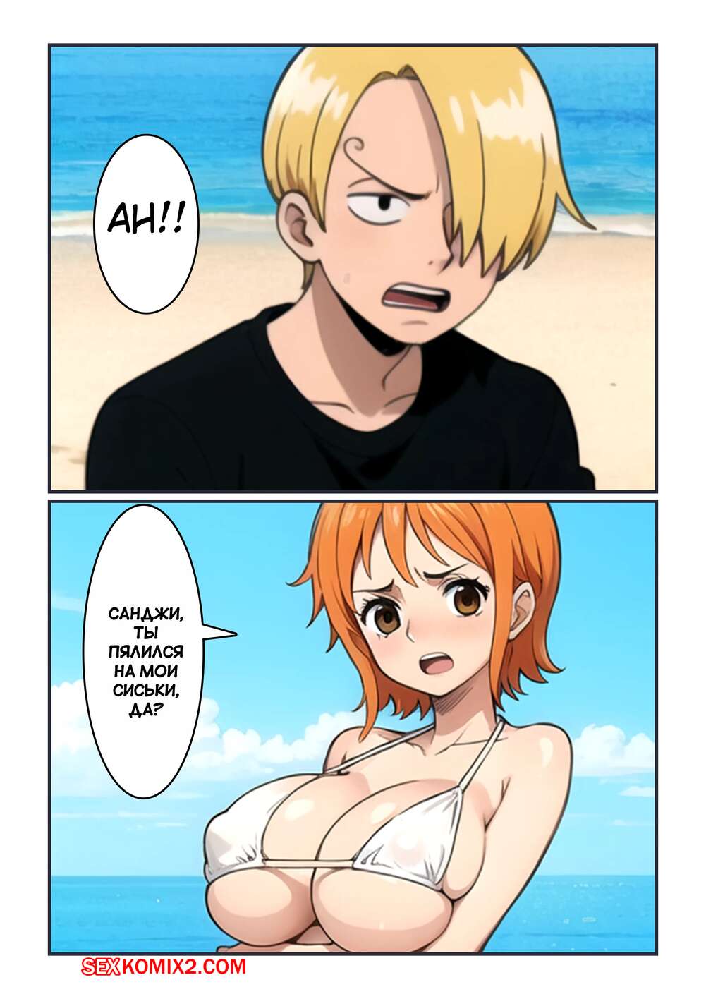 Порно комикс One Piece. Солнечные пески. Sunny Sands. Kahoo Нами заметила, что Санджи пялится на ее сиськи на пляже и решила с ним повеселиться. Красотка разделась и раздвинула ножки перед парнем, после чего дала ему себя выебать в пизду и задницу.