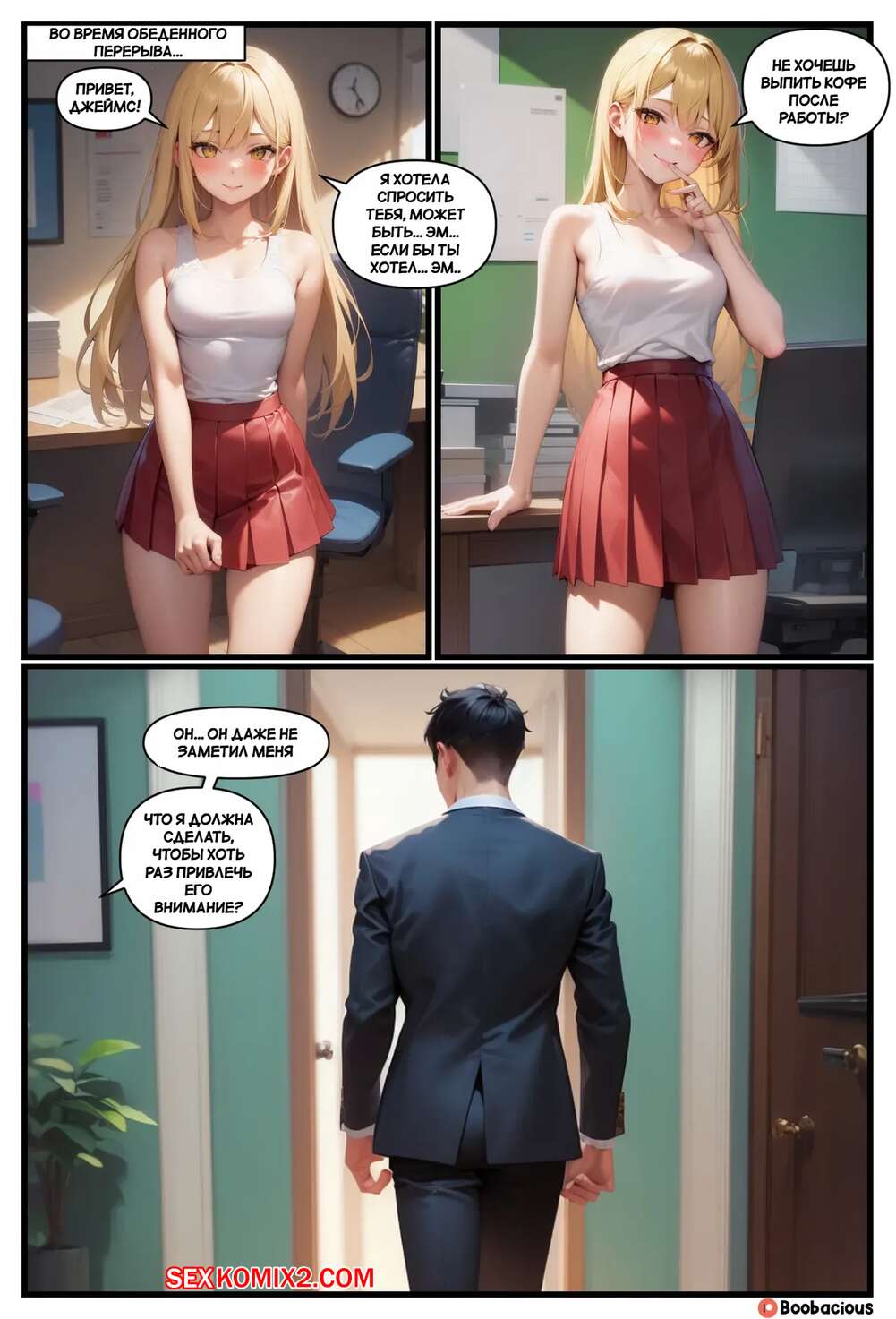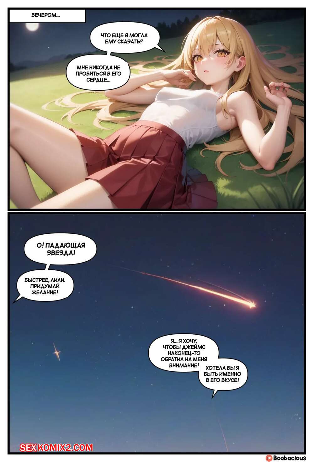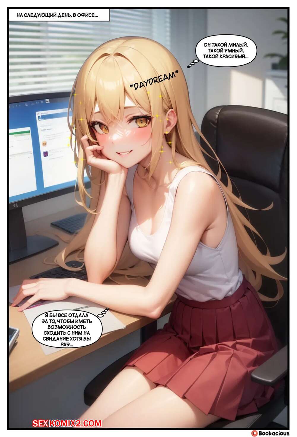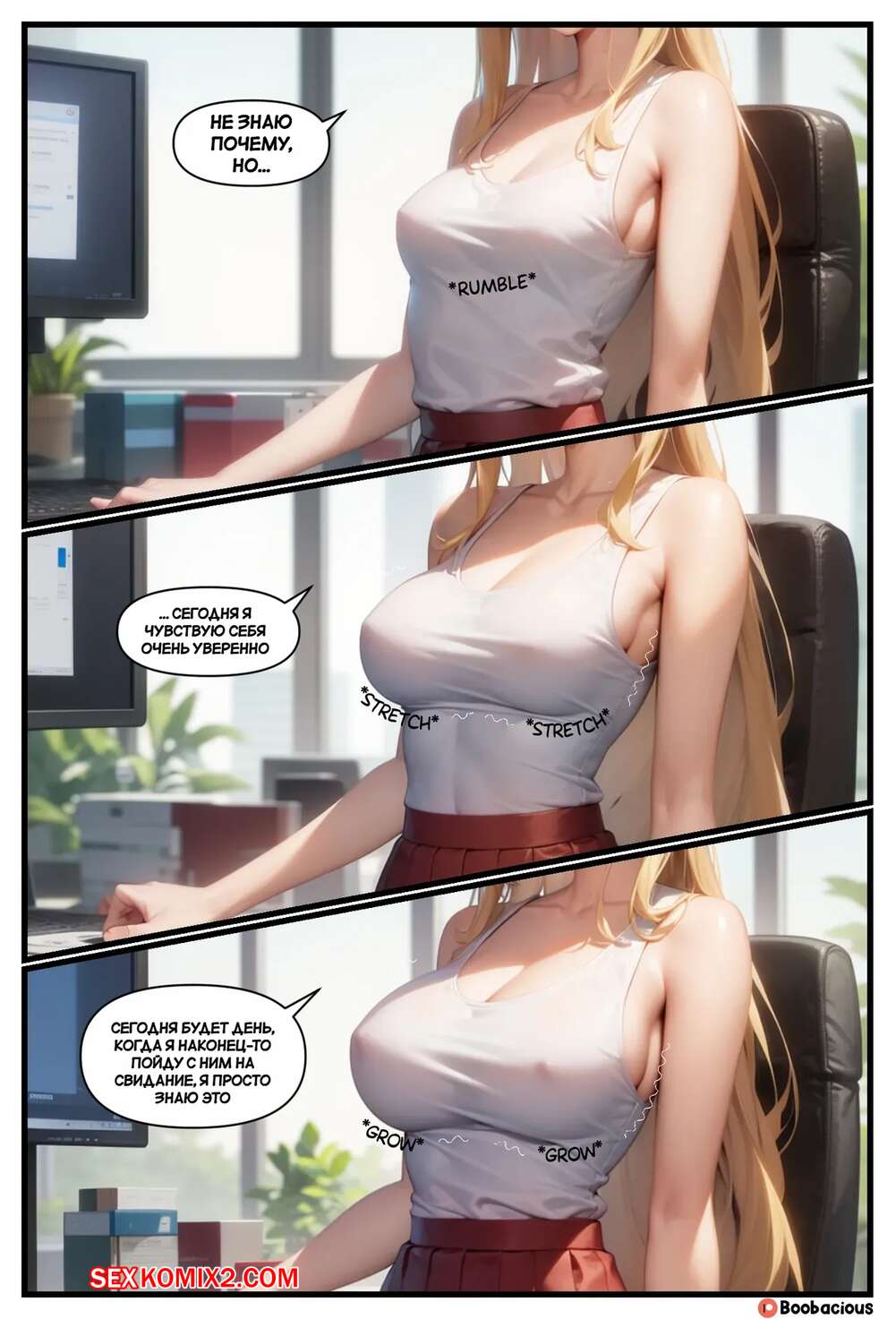 Порно комикс Звездный перелом. Часть 1. Starstruck Shapeshift. Boobacious. Горячая блондинка находилась на работе в офисе и в этом момент с ней стали происходить невероятные изменения. Тело красотки увеличилось в размерах, а ее сиськи и задница стали невероятно аппетитными.