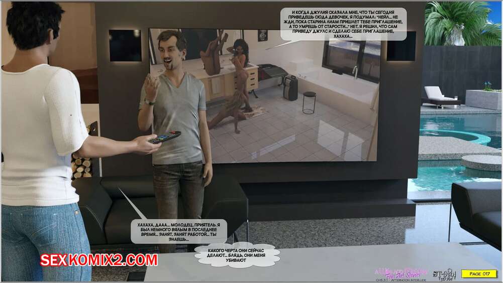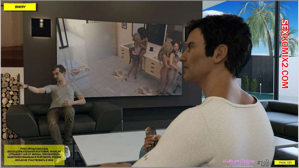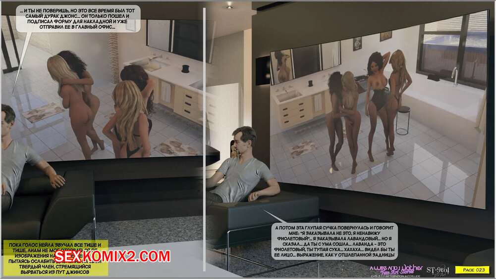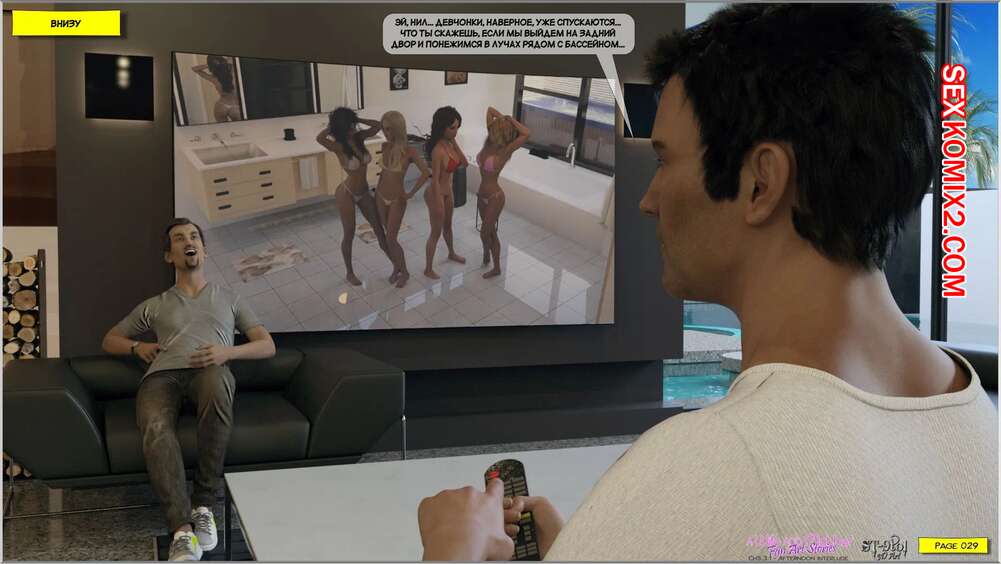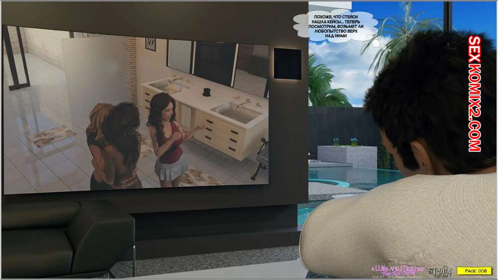 Порно комикс Интерлюдия после полудня. Afternoon Interlude. ST9to1 Горячие подруги отправились в ванну, чтобы переодеться для купания в бассейне. Красотки переоделись и стали страстно целоваться, пока их дружки наблюдали за ними через скрытую камеру.