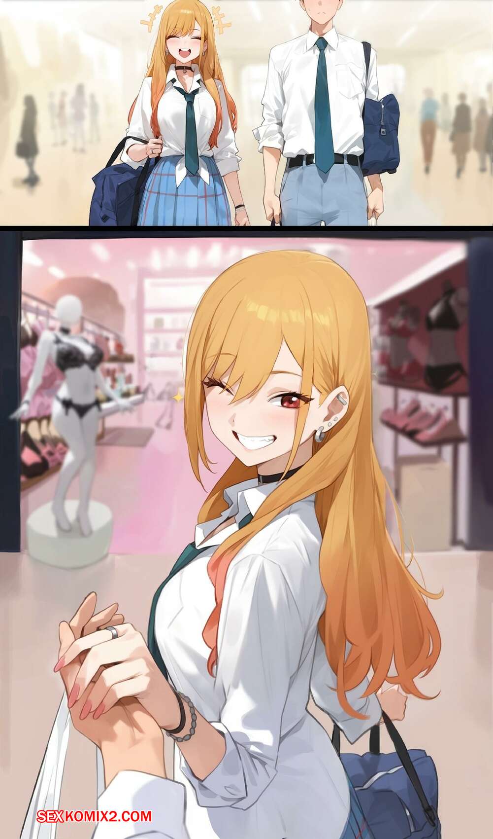 Порно комикс Китагава Марин в гардеробе. Kisou Горячая блондинка пришла в магазин со своим дружком и повела его в примерочную, чтобы повеселиться. Красотка разделась и возбудила парня шикарным телом, после чего дала ему себя выебать.