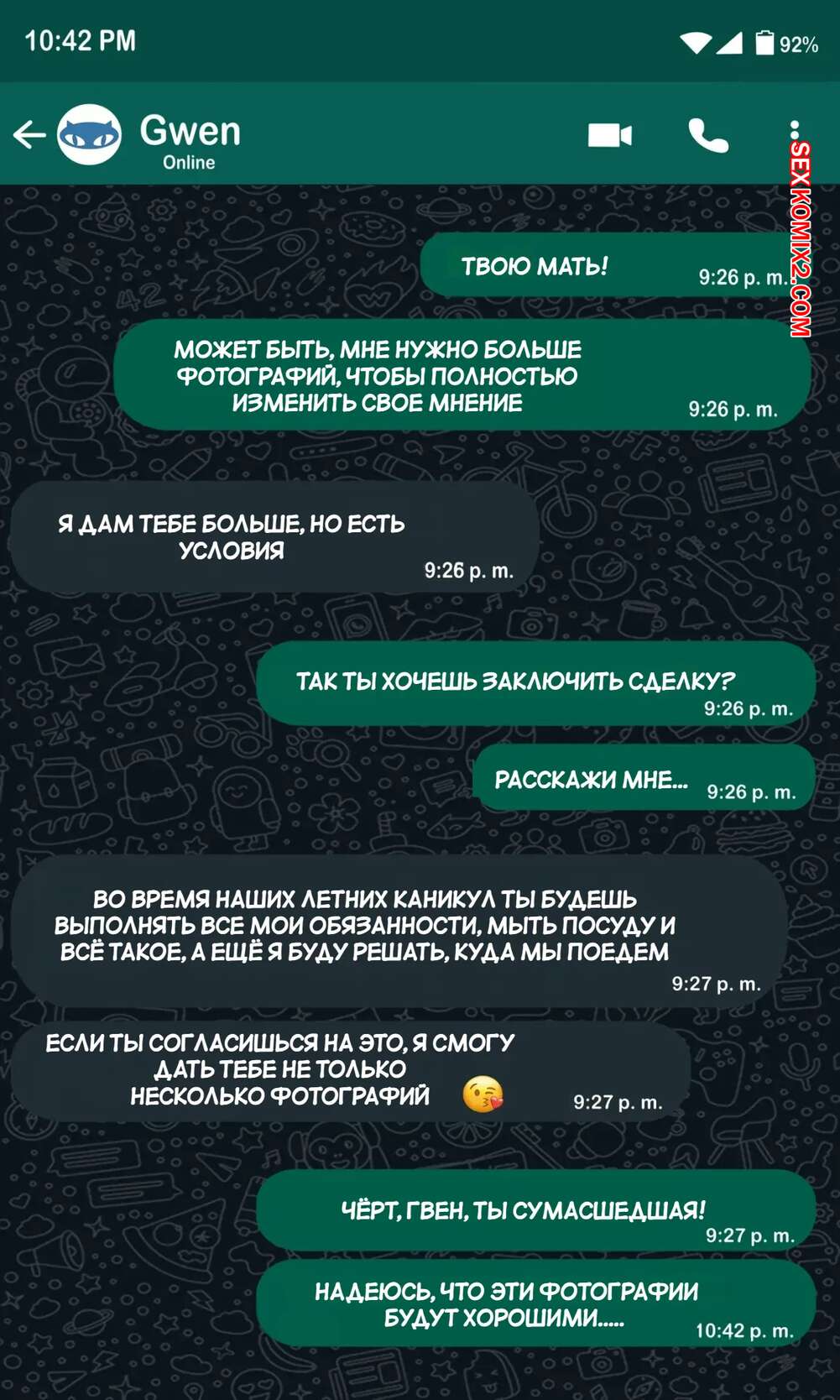 Порно комикс Бен 10. Чат с кузиной. Chat with my Cousin. Kenergi Рыжая красотка Гвен была очень возбуждена и решила повеселиться со своим кузеном Бен. Девушка написала парню и стала отправлять ему откровенные фотографии, возбуждая Бена.
