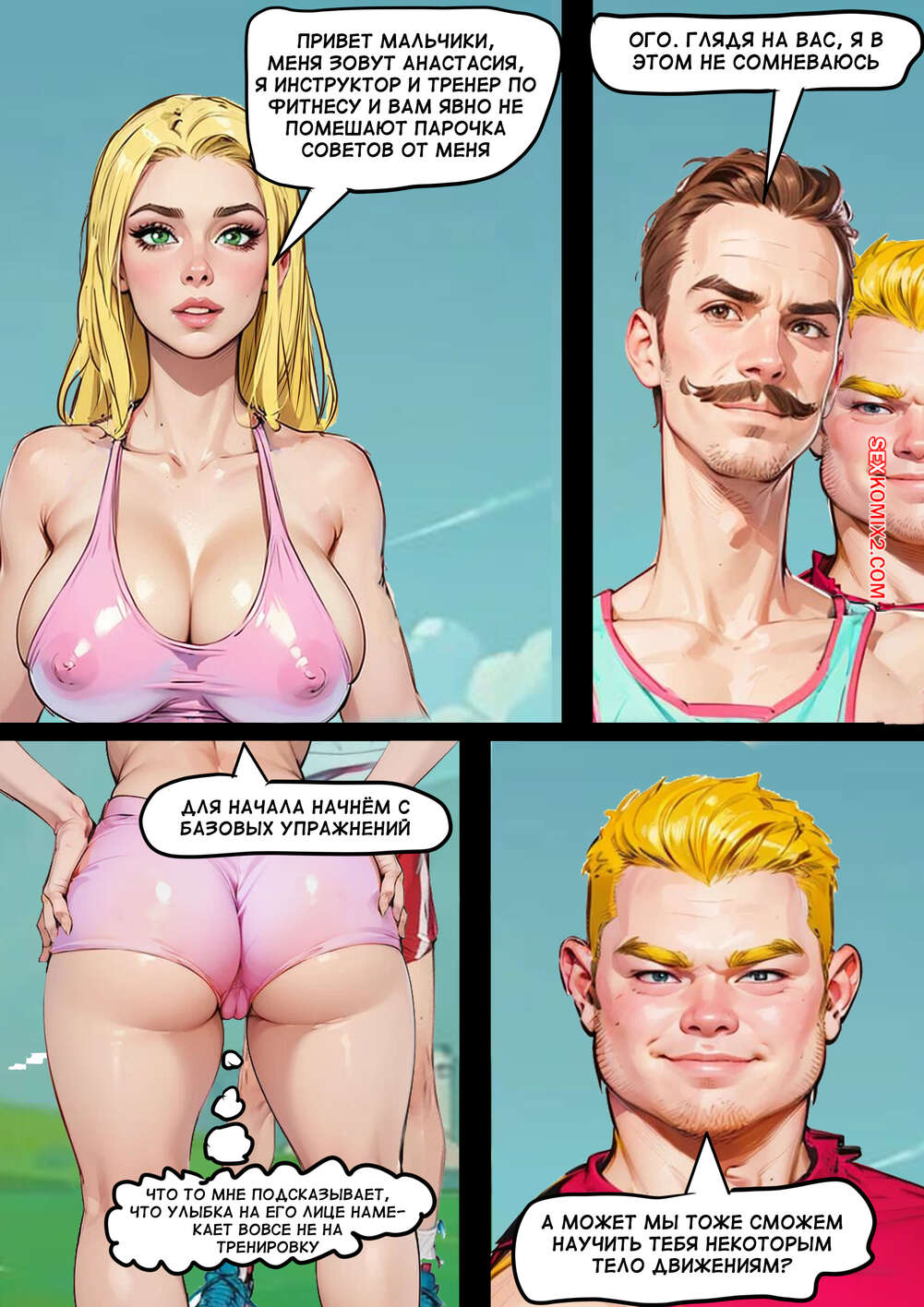 Порно комикс Анастасия тренируется в парке. mr cookie by sexkomix2.com Анастасия отправилась на тренировку в парк, где решила помочь с упражнениями двум парням. Вместо этого они стали ласкать девушку и дали ей отсосать свои хуи, после чего устроили ей двойное проникновение.