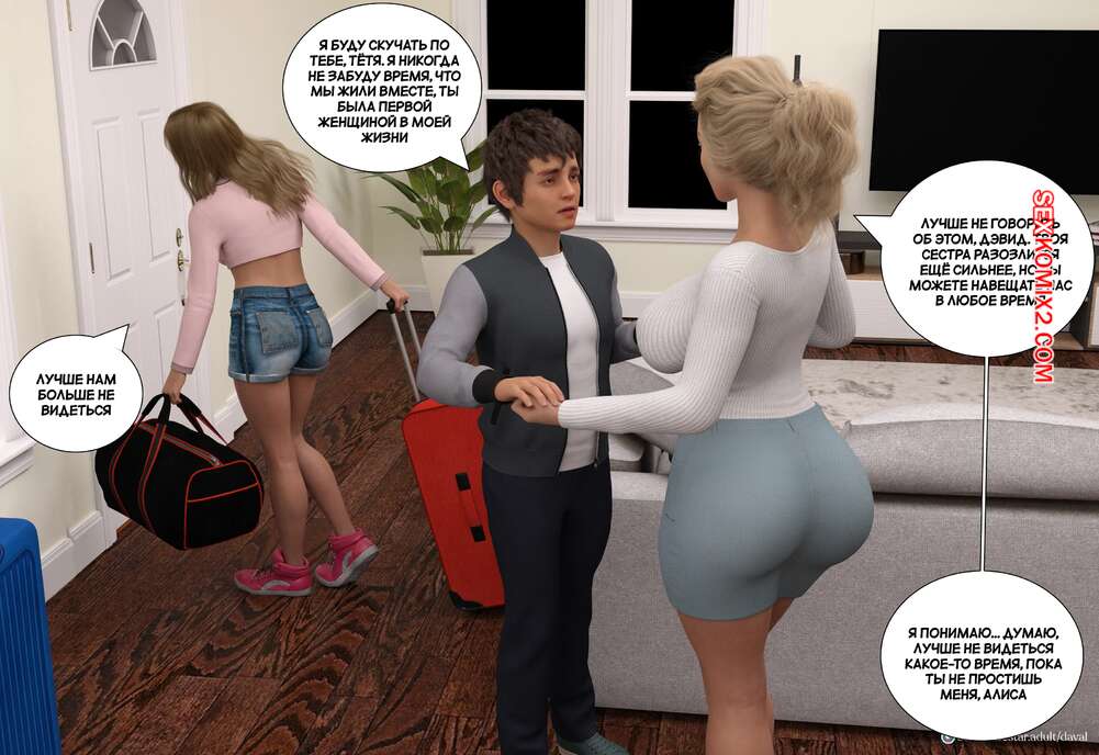 Порно комикс Вместе. Часть 10. Together. Daval3D Аарон кончил в свою мамку, от чего он сильно переживала. Сара сделала все, чтобы вытолкнуть из себя сперму сына, а затем пошла поговорить с ним. В комнате Дэвида голый Аарон набросился сзади на маму, желая продолжить веселиться с ней.