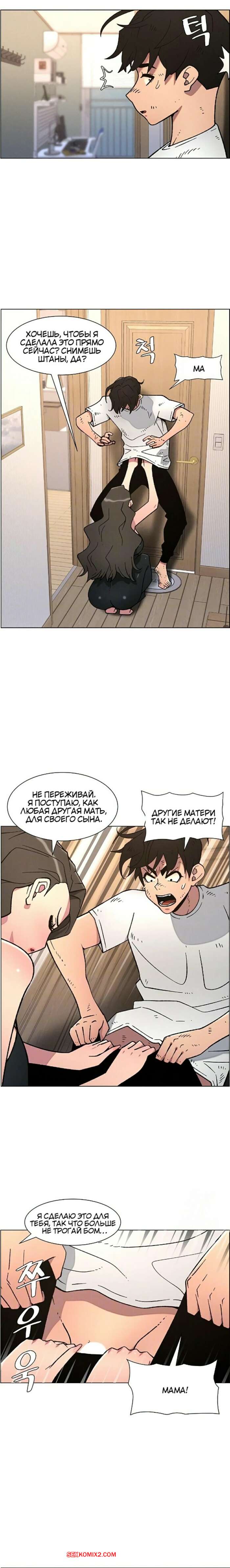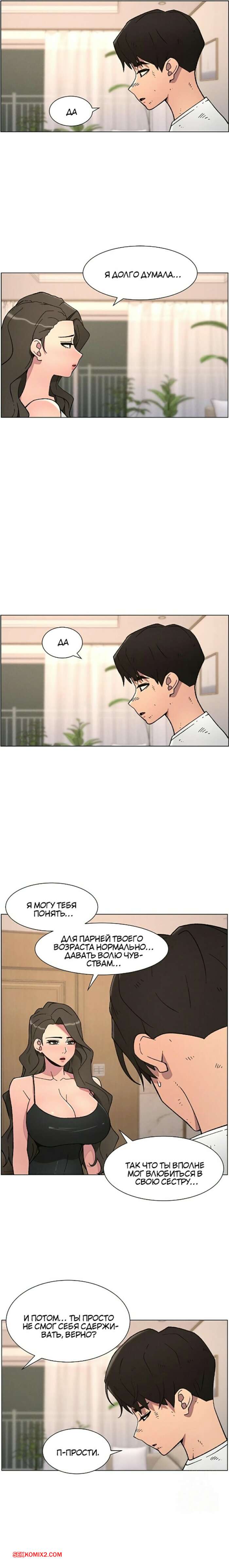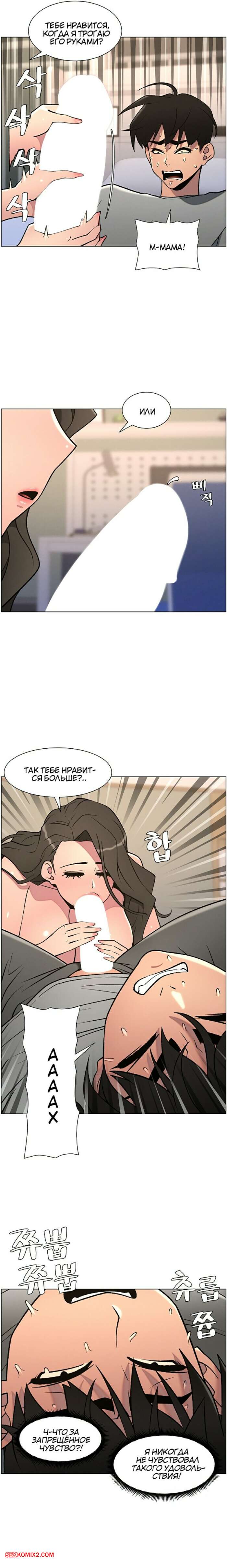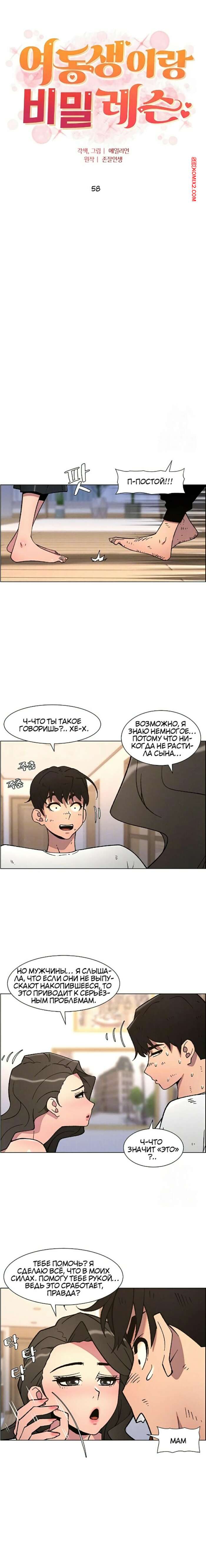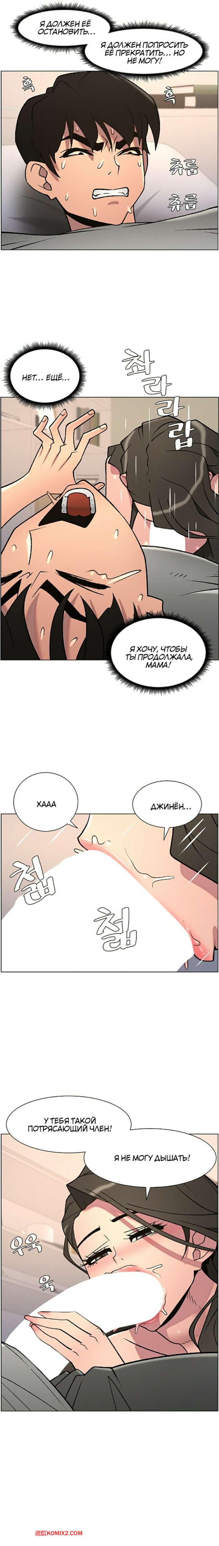 Порно комикс Тайный урок с моей сестрой. Часть 57 и 58 и 59 Парнишка вернулся домой и поспешил принять душ, где к нему присоединилась возбужденная брюнетка. Затем парень отправился спать, но к нему пришла его горячая мамка и стала сосать член сына.