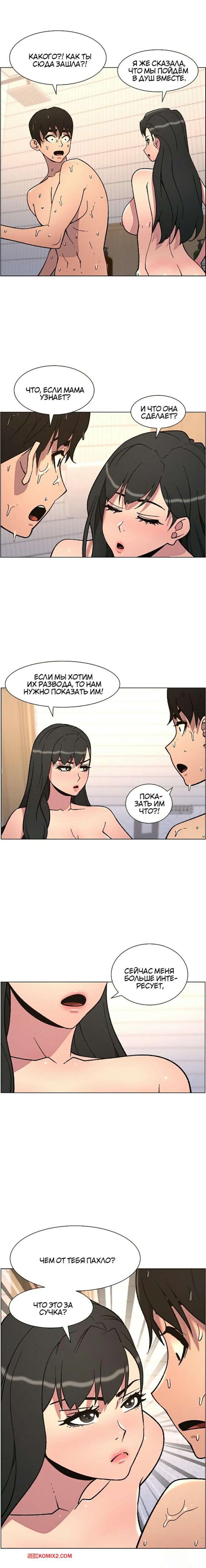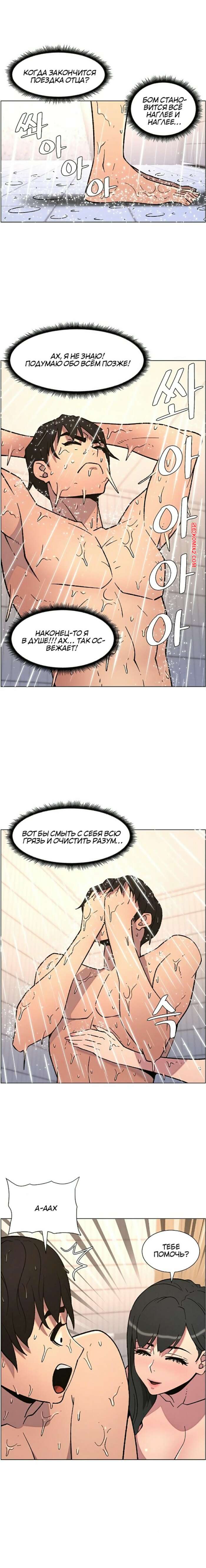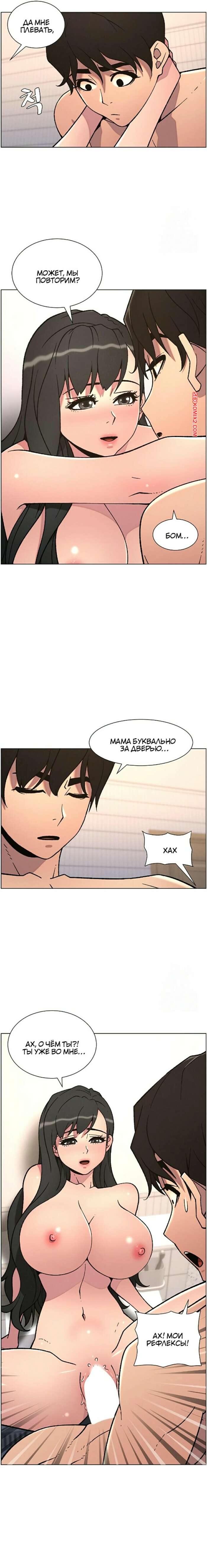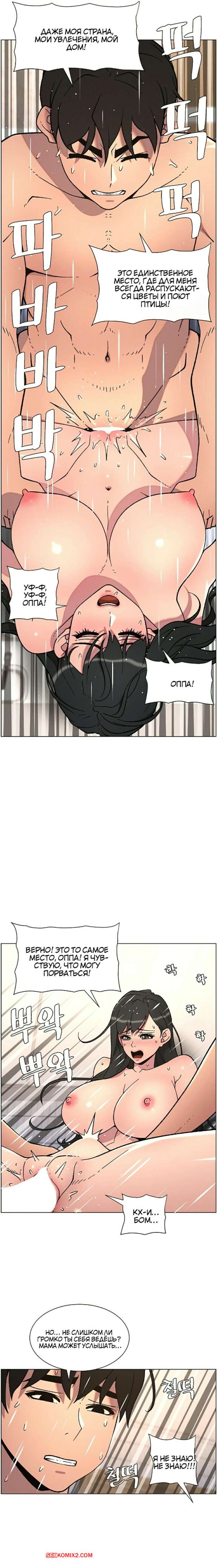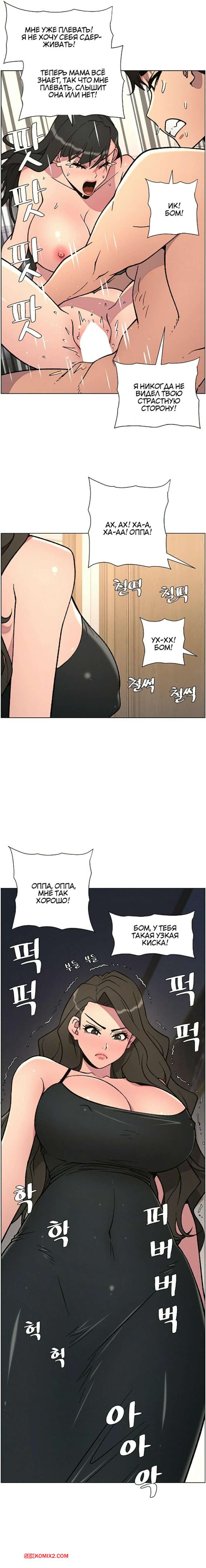 Порно комикс Тайный урок с моей сестрой. Часть 57 и 58 и 59 Парнишка вернулся домой и поспешил принять душ, где к нему присоединилась возбужденная брюнетка. Затем парень отправился спать, но к нему пришла его горячая мамка и стала сосать член сына.
