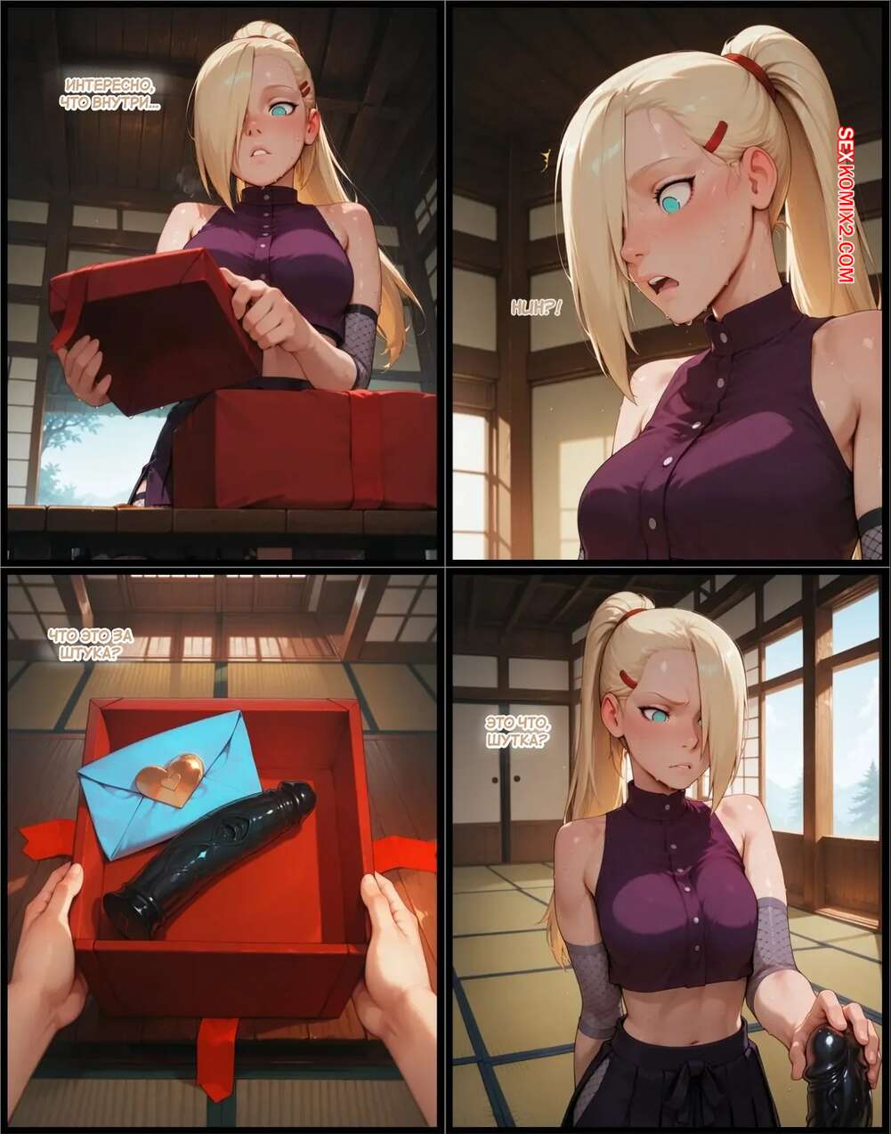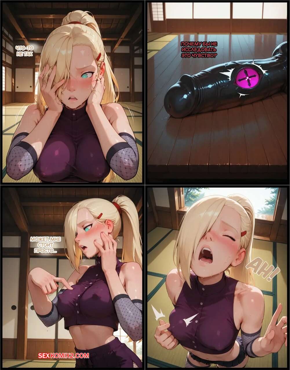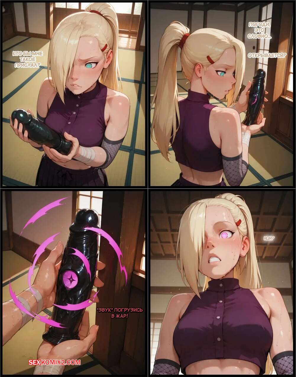 Порно комикс Наруто. Деревня Эрос. Часть 4. The Village of Eros. Sax Красотка получила в подарок заколданный дилдо, изза чего сильно возбудилась. Девушка разделась и стала ласкать свою пизденку, после чего к ней присоединилась подруга и они устроили страсную еблю.