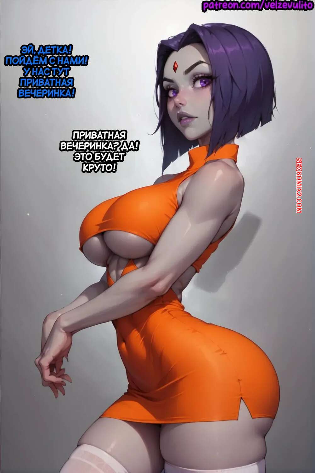 Порно комикс Teen Titans. Рейвен в клубе. Raven In Da Club. Velzevulito. Красотка Рейвен пришла в клуб в откровенном наряде, где соблазнила сразу нескольких парней. Все вместе они отправились в туалет, где девушка отсосала их члены и дала себя выебать во все дырочки.